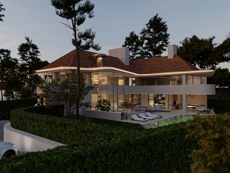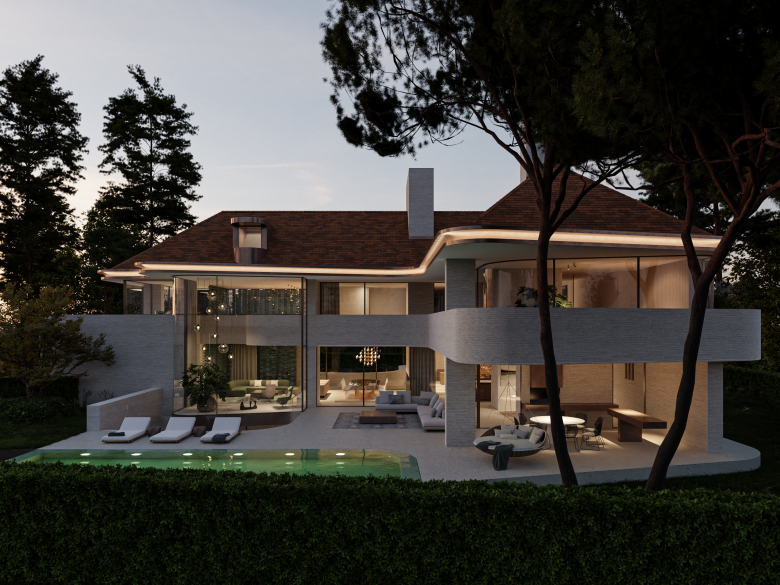The round, dynamic lines flow seamlessly from the exterior to the interior, continuing inside where they bring the spaces to life. The organically shaped garden further enhances the harmony between the architecture and its surroundings, completing the design. A subtle balance between tradition and modernity, creating a unique and inspiring living experience.