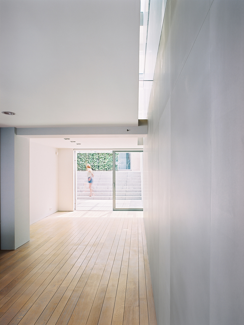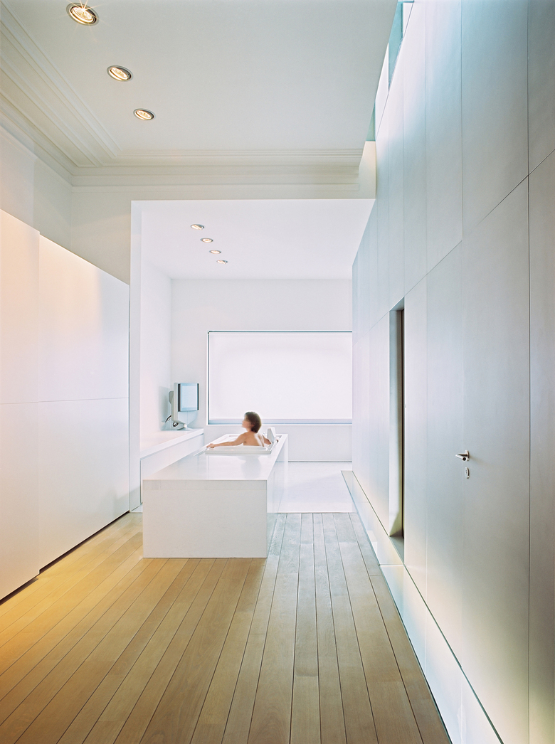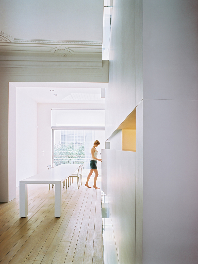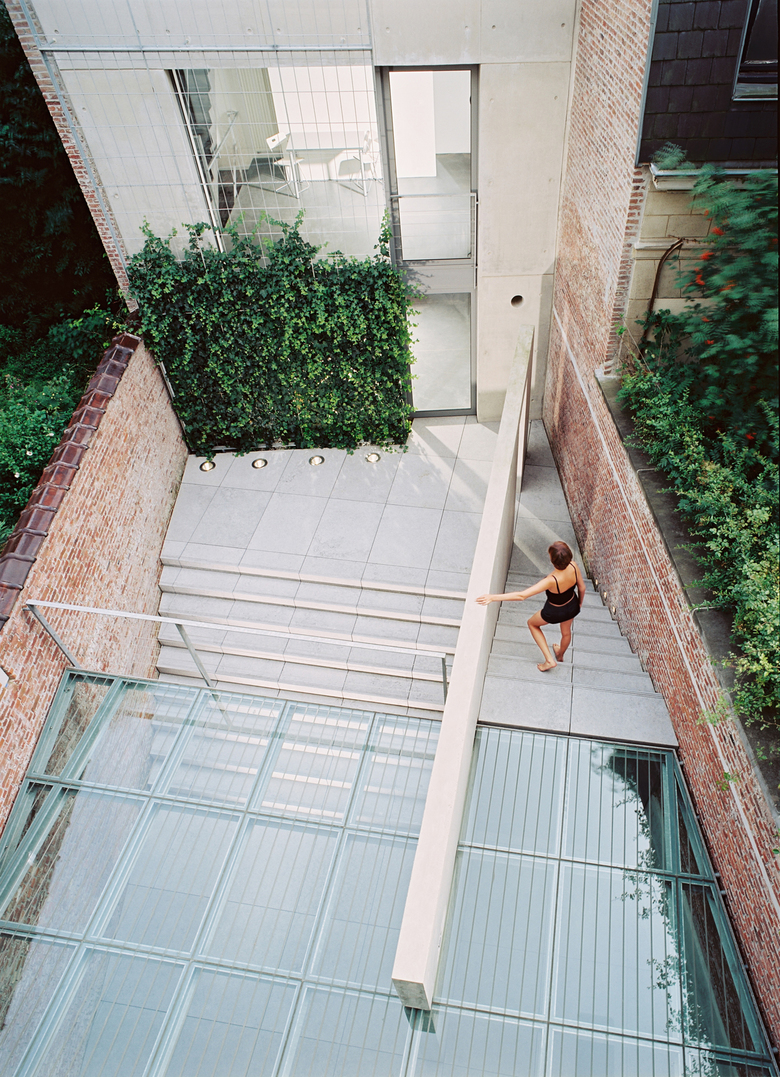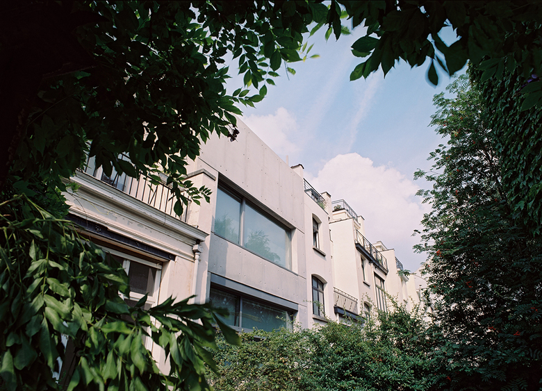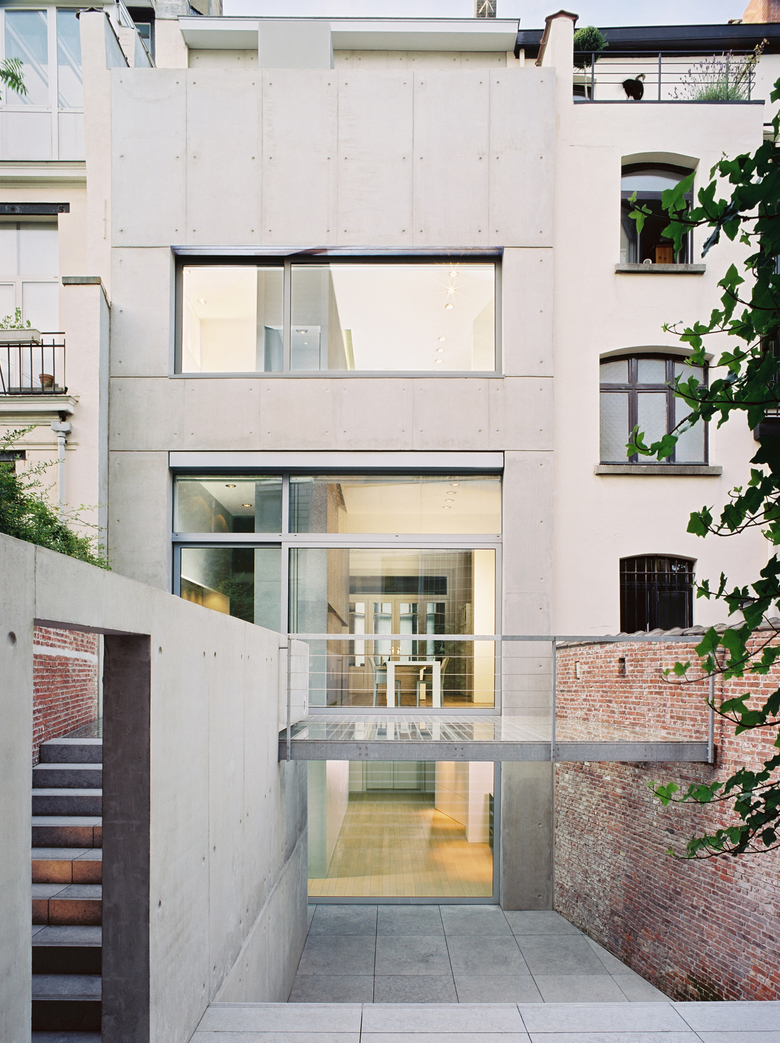 Maison de maître revisitée par des interventions résolument contemporaines. Un monolithe vertical en aluminium brossé se glisse parallèlement à l’ancien escalier. Il unifie les différents niveaux et abrite un ascenseur et des locaux techniques. La façade avant a été restaurée. La façade arrière, en mauvais état, a été démolie et remplacée par un voile en béton. Les larges baies qui y sont pratiquées s’ouvrent sur une cour minérale qui mène à la conciergerie complètement reconstruite.