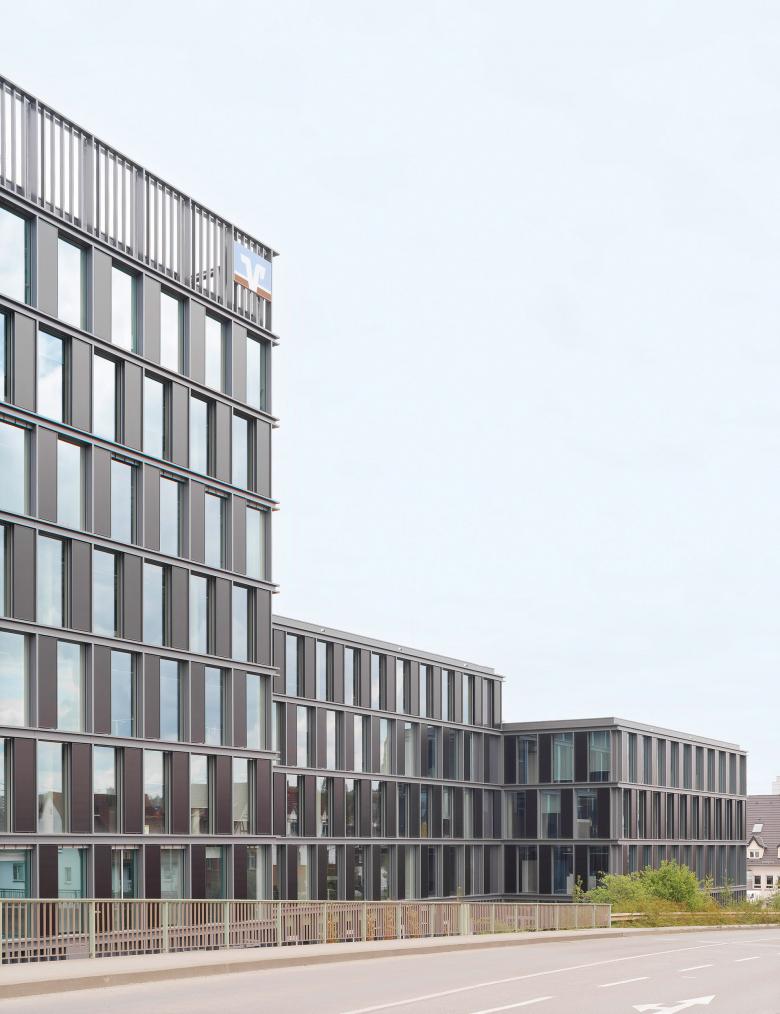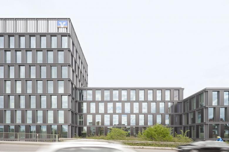 Neubau Verwaltungsgebäude Volksbank Mittlerer Neckar eG, Wendlingen am Neckar als eine Gebäudeeinheit aus drei ineinander geschobenen Baukörpern.