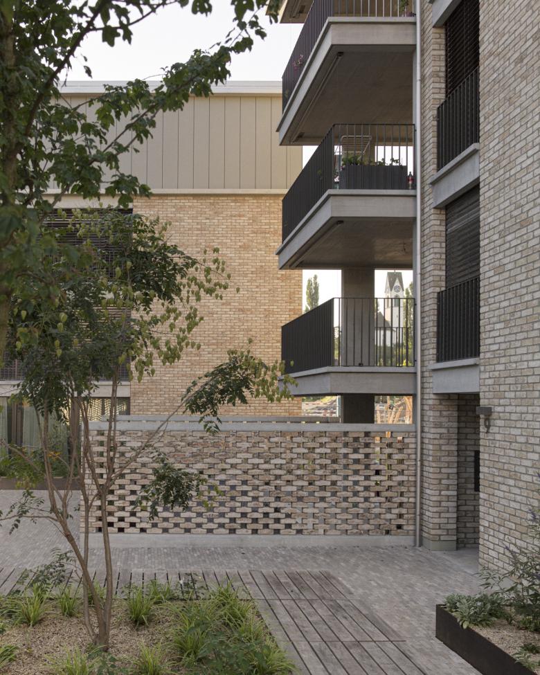 Das äussere Erscheinungsbild ist geprägt von einem Sichtbetonsockel, einem zweischaligen, hochwertigen Sichtmauerwerk aus Klinkersteinen und im Dachgeschoss von hinterlüfteten Aussenwandverkleidung, sowie von grosszügigen, geschosshohen Fenstereinsätzen aus Holz/Metall und massiven Kunststeinelementen. Der hofübergreifende Einsatz dieser Elemente schafft einen vielfältig stimmigen Gesamteindruck.