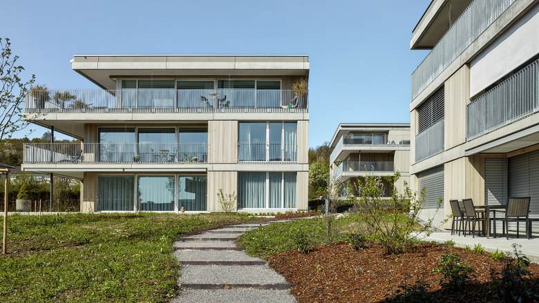 Die fünf Häuser sind zueinander versetzt und der Topografie entsprechend in der Höhe gestaffelt angeordnet. Damit wird eine optimale Freistellung der Baukörper und eine Vernetzung mit den Aussenräumen nach Süden und Westen für alle Gebäude und Wohnungen ermöglicht. Die Erschliessung der Häuser erfolgt gestaffelt von der Wanneggstrasse her.