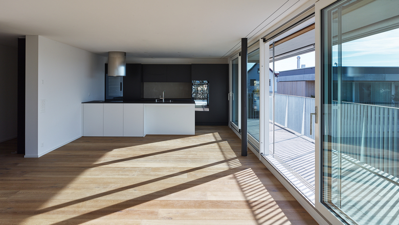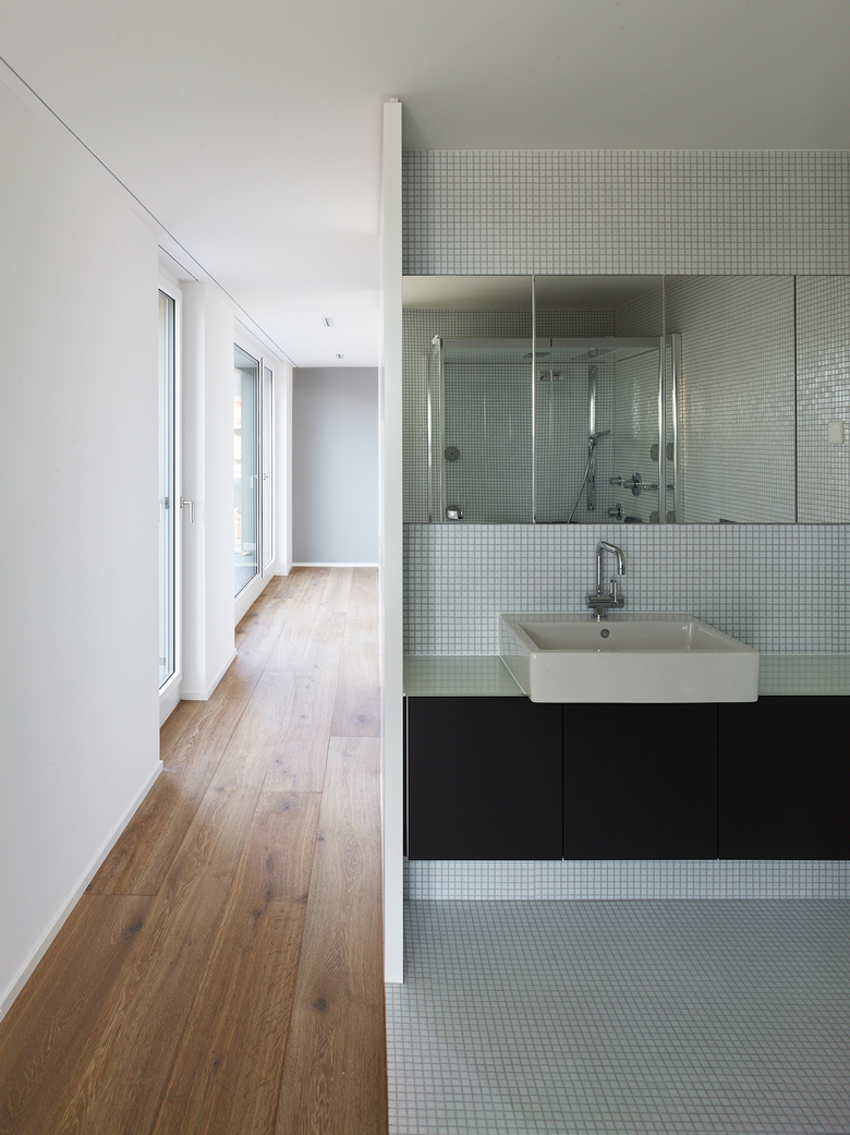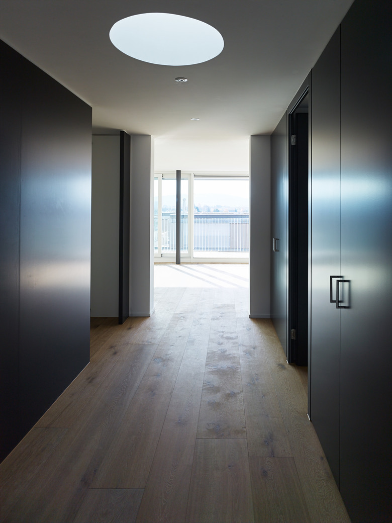 Die gewählte Baustruktur ermöglicht die Realisierung von zwei Haustypen A und B mit total 15 grosszügigen individuellen Geschosswohnungen mit 3½ bis 5½ Zimmern. Pro Geschoss wird jeweils nur eine Wohnung angeordnet. Dies hat den Vorteil, dass die Wohnungen die Qualitäten eines Penthauses mit den Vorzügen von grosser Privatheit, allseitiger Orientierung und grosszügigen Terrassenflächen verbinden. Folgerichtig werden die Treppenanlagen offen im Aussenbereich geführt und ein rollstuhlgängiger Lift führt direkt vom Kellergeschoss und von der Tiefgarage zu den einzelnen Wohnungen.