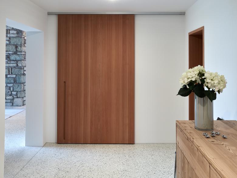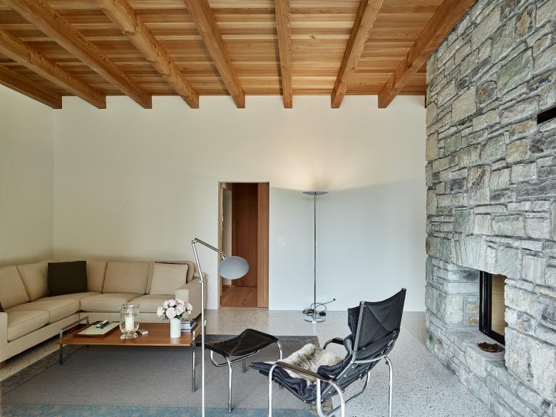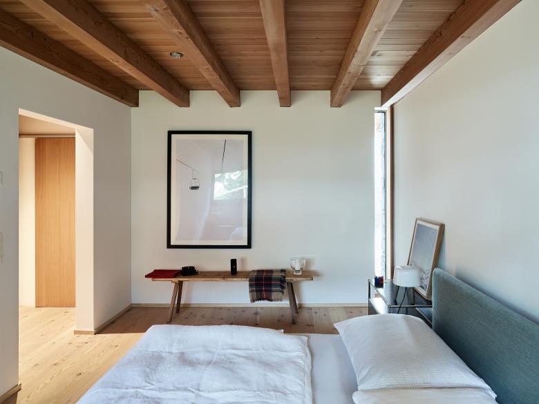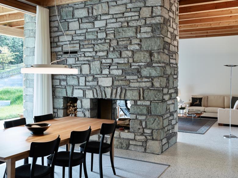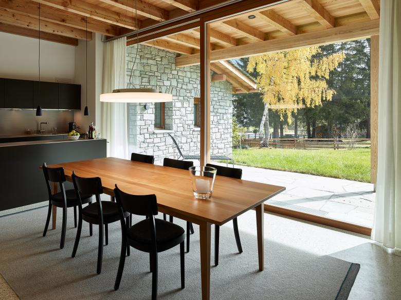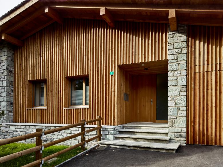 Regionales Lärchenholz wurde für die Dachkonstruktion, Fassadenverkleidung und die Fenster verwendet. Im Innern sind auch der Bodenbelag der Schlafzimmer, Türen und Schrankeinbauten in Lärche gefertigt. Die Reduktion der Materialisierung schafft Klarheit im Konglomerat von Alt und Neu und durch die Natürlichkeit der Verwendung auch eine erhabene Wohnatmosphäre.