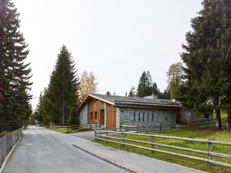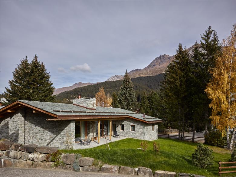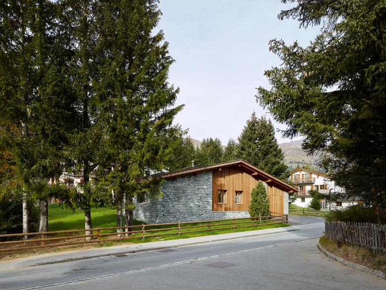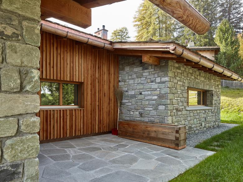 Die Materialwahl basiert auf der Reduktion auf Stein und Holz. Natursteine aus Soglio und Andeer als Material für das Fassadenmauerwerk, Stein aus Andeer als gebrochener Zuschlagsstoff für die Terrazzobeläge des Wohnraums, Malencoplatten als schützendes Material auf dem Dach.