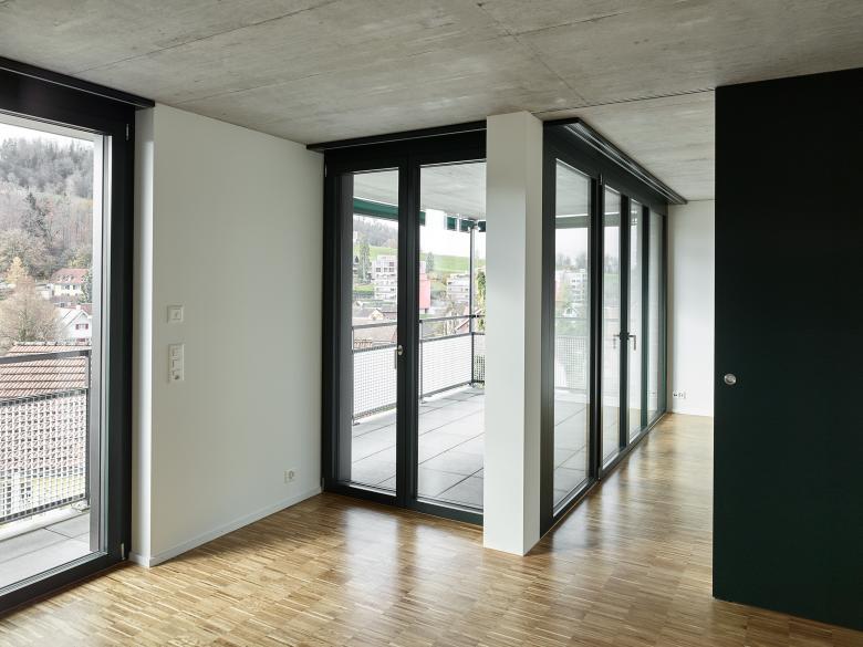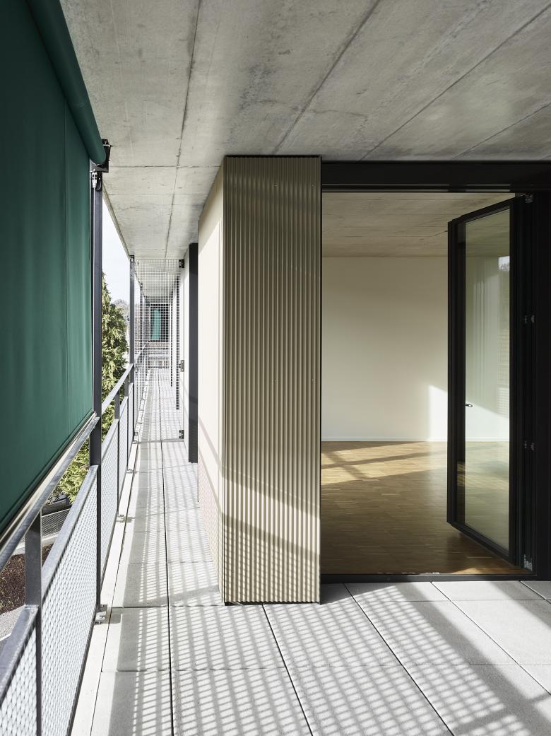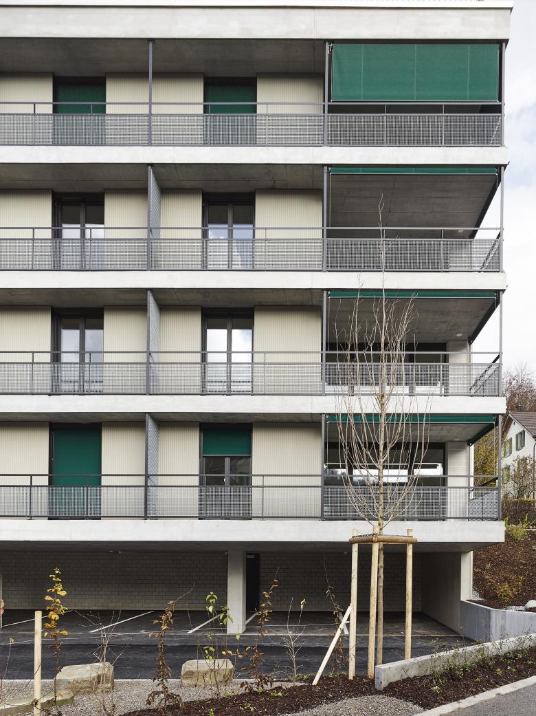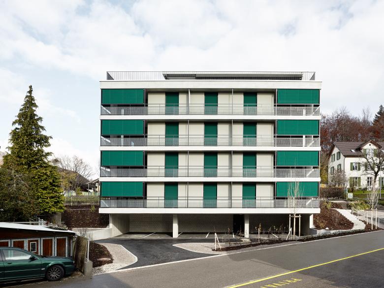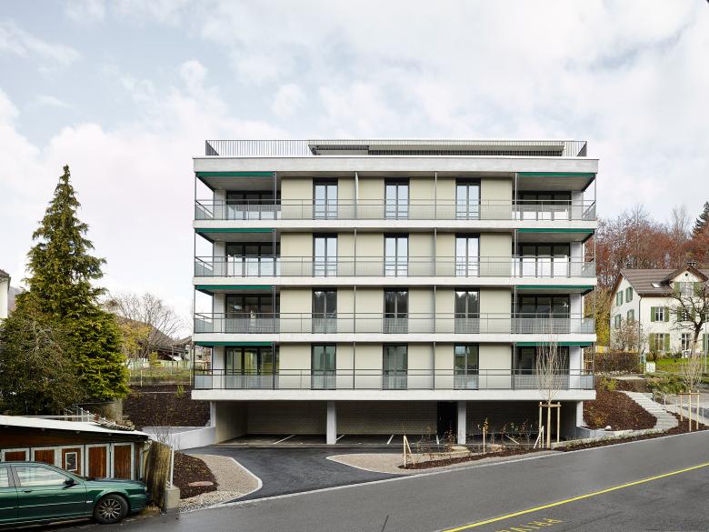Bei den herausfordernden Platzverhältnissen und der beinah dreieckigen Parzellenform wird der knapp eingeschossige Niveauunterschied zwischen Sunneraistrasse und Buchenweg geschickt für eine Einstellhalle genutzt. Darüber folgen drei Regelgeschosse mit je einer 2.5-Zimmer und einer 3.5-Zimmer Mietwohnung. Im dritten Obegeschoss wechselt der Grundriss und bietet, neben einer 2.5-Zimmer Wohnung, Platz für das Schlafgeschoss der Attikawohnung mit 4.5-Zimmer. Die über die volle Gebäudebreite laufende und ganz Tags besonnte Balkonschicht ist von jedem Zimmer über raumhohe Balkonfenster begehbar und verleiht jeder Einheit einen grosszügigen Aussenraum.