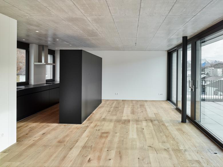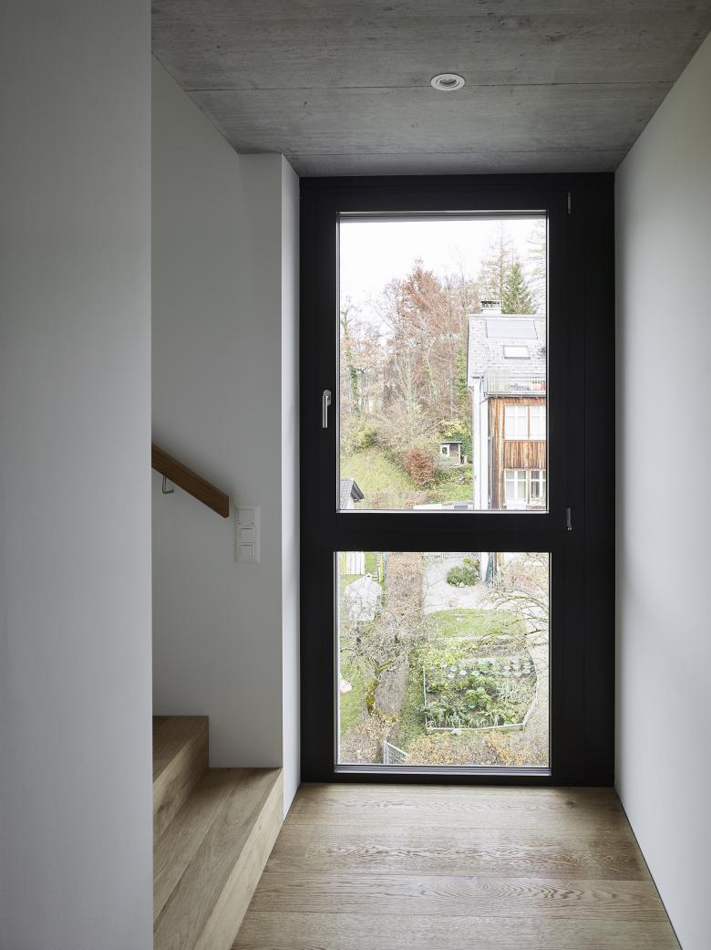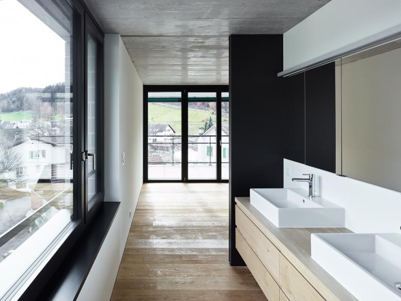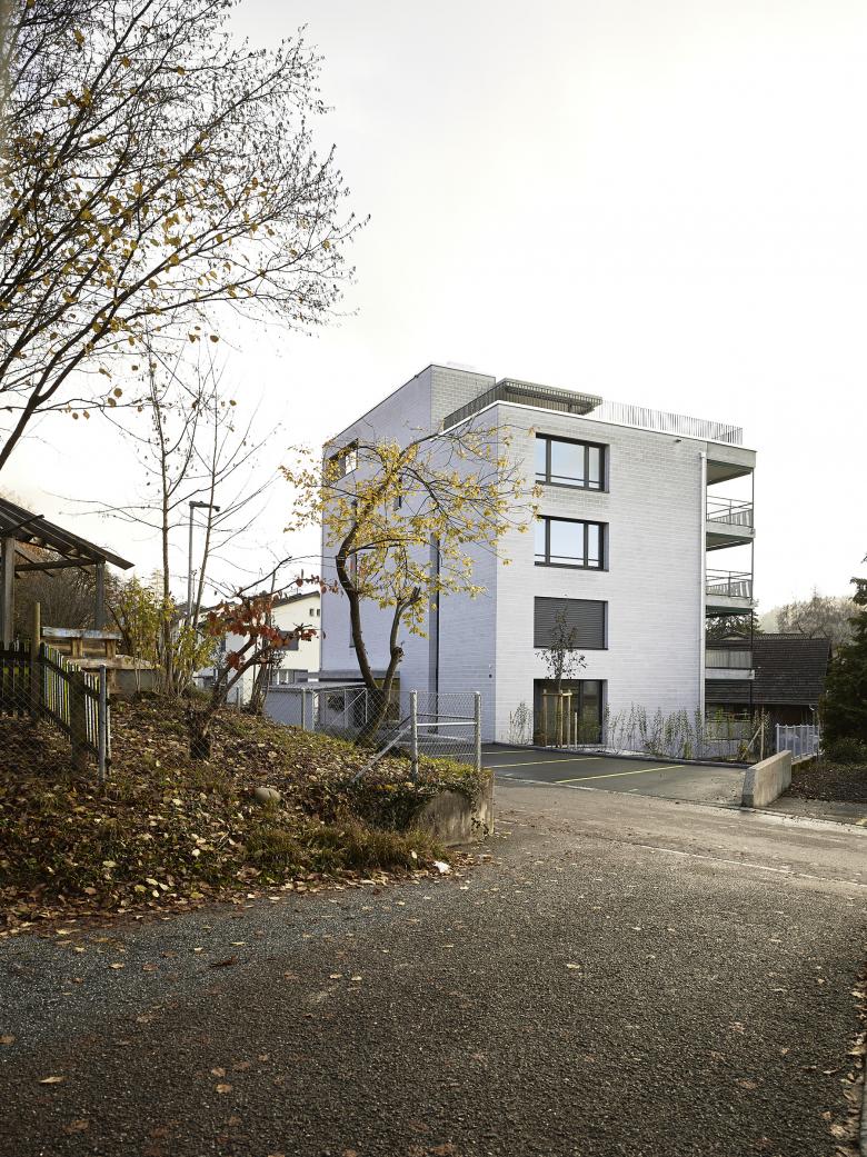 Das Haus ist in massiver Bauweise ausgeführt. Die Fassade ist geprägt vom Sichtmauerwerk in Kalksandstein und Vordachelementen in Beton. Grosse Öffnungen sorgen für eine helle Raumatmosphäre. Die Kombination von Holzparkettböden mit Sichtbetondecken spricht eine zeitlos moderne Architektursprache.