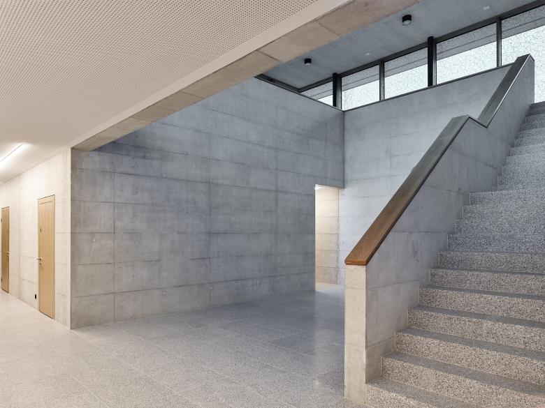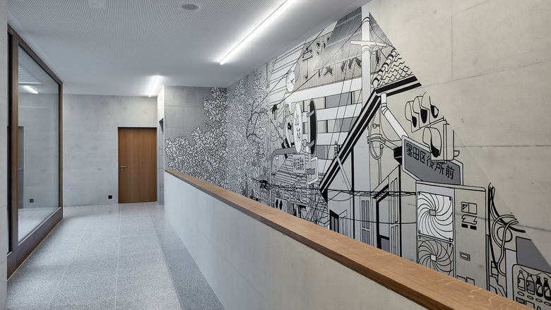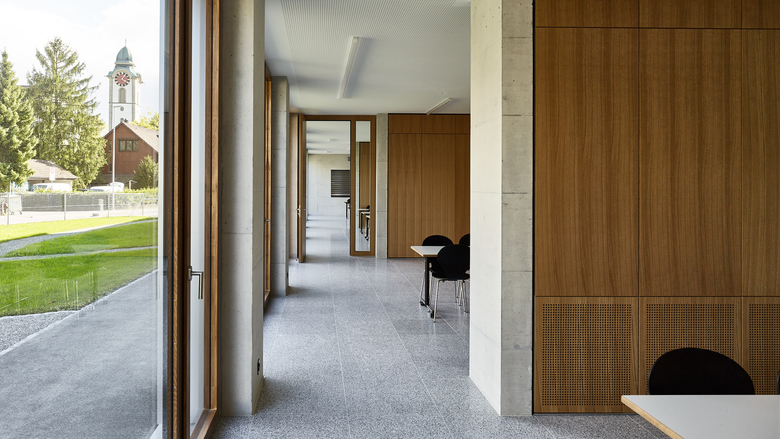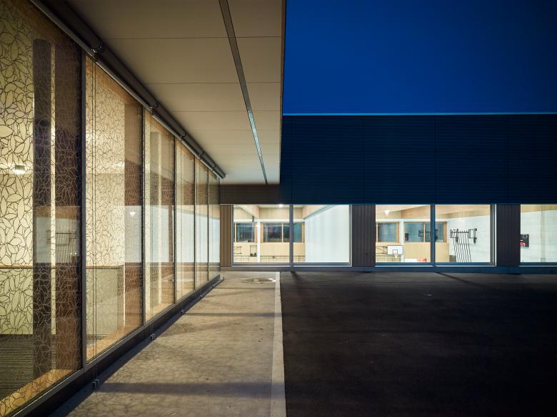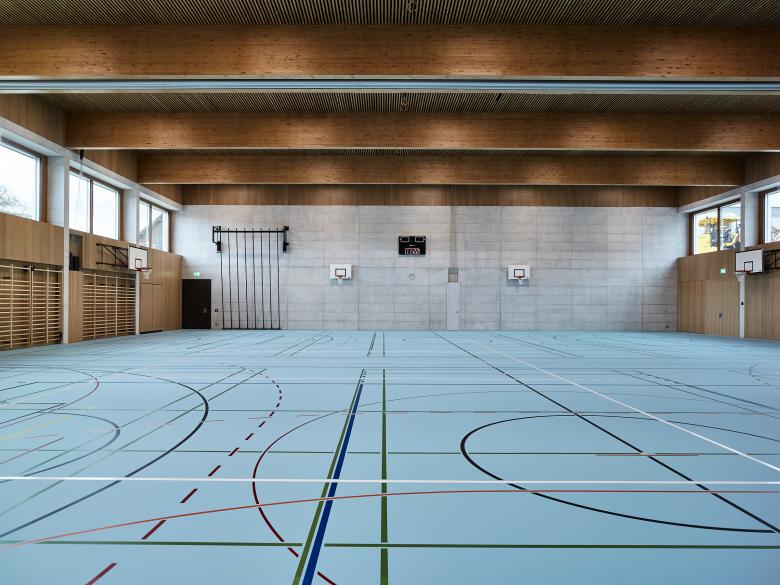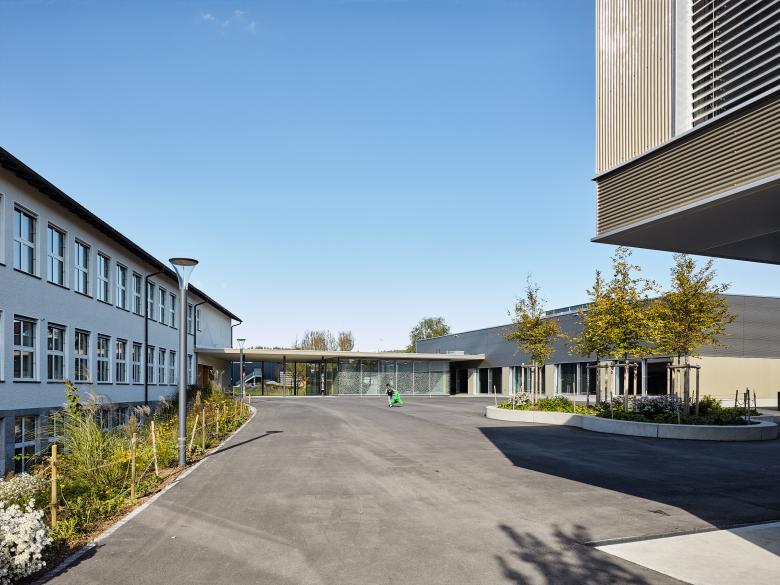 Auf der dem Schulhof abgewandeten Seite wird das Schulhaus Feld um ein schlankes, zweigeschossiges Volumen erweitert. Im nördlichen Teil des Platzes werden die Turnhalle und das Schulhaus Feld wie bis anhin mit einem eingeschossigen Verbindungsdach verbunden, was der Hofsituation räumlich Rückhalt verschafft.