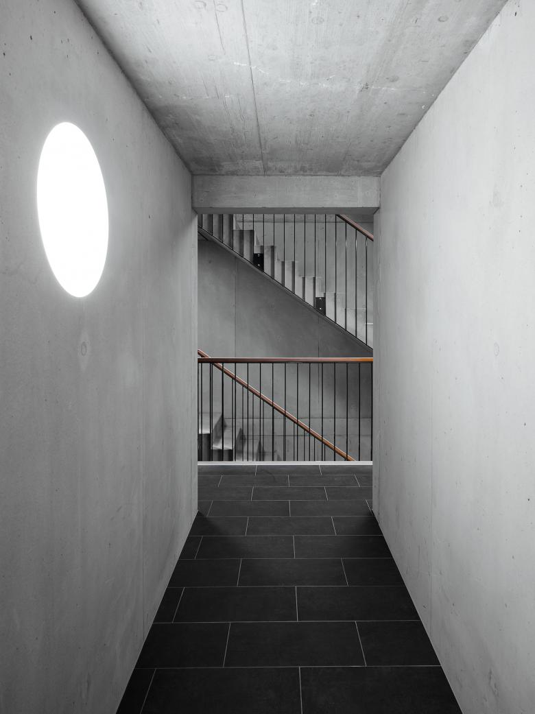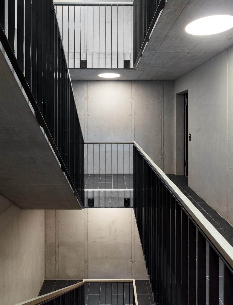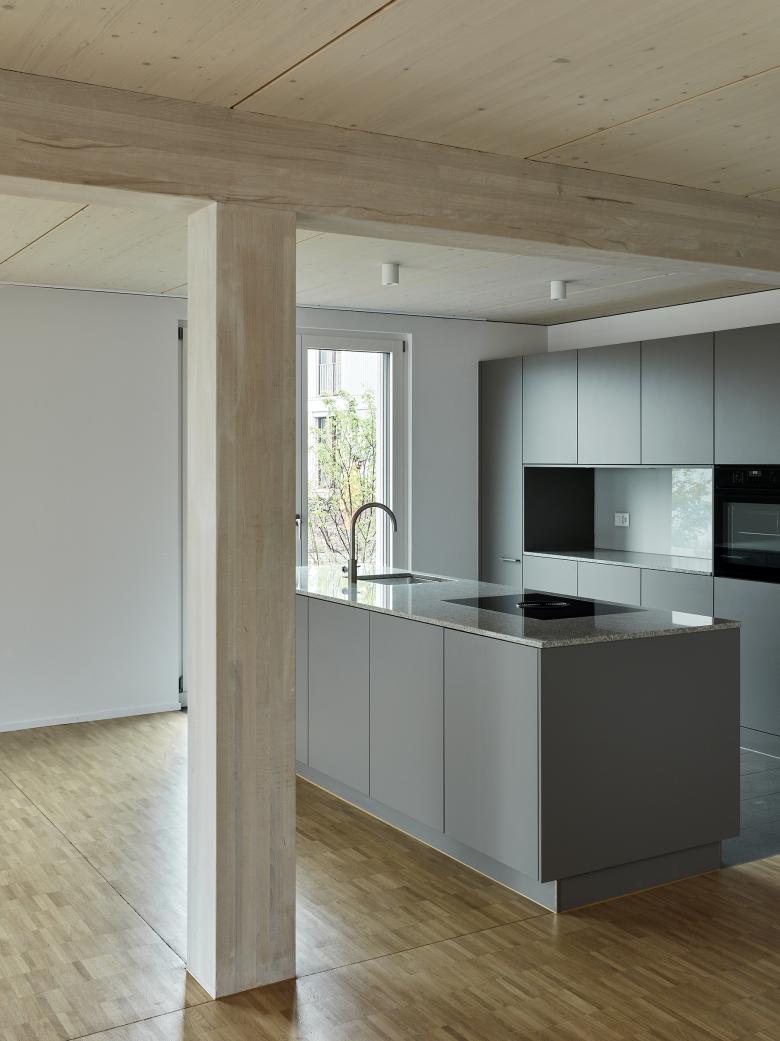 Die Grundrisse werden gemäss den bestellten Grössenanforderungen geschnitten. Bewusst werden daher zugunsten von Wohnflächen alle Verkehrsflächen auf ein Minimum reduziert. Zimmer können je nach Bedarf dem Wohnraum als Erweiterungsmöglichkeit zugeordnet oder aber als Schaltzimmer zur Steuerung des Wohnungsmixes verwendet werden. Innerhalb des gewählten Rasters lassen sich verschiedene Grundrisskonfigurationen umsetzten. So können Raumanordnungen gewählt werden, die Wohnen und Essen in einer räumlich grosszügigen Hallenform unterbringen, oder aber Lösungen, welche Wohnen und Essen mit Küche über die Diagonale aufteilen. Mit einem einfachen Grundmodul wird somit die Basis für ein „Raumlabor“ gelegt, welches in weiteren Entwicklungsschritten verfeinert werden kann.