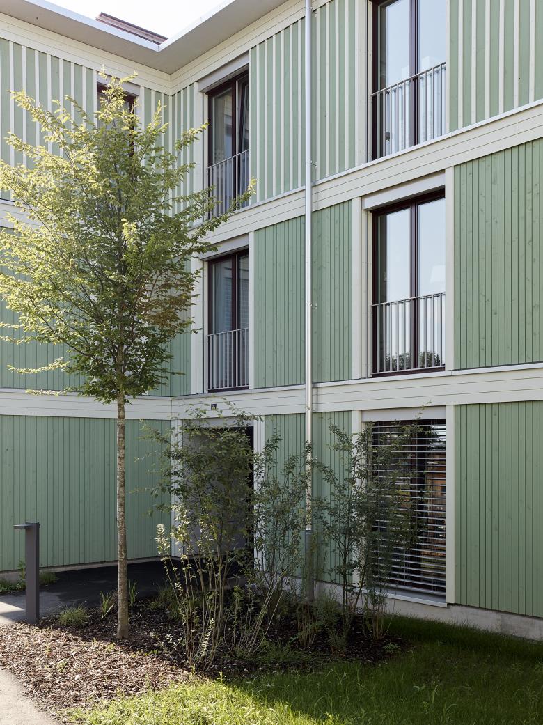 Die Gebäude werden in Holzelementbauweise auf einem betonierten Unterschoss erstellt. Das Konstruktionsmaterial Holz soll in der Fassadengestaltung und in der Innenraumgestaltung zum Ausdruck kommen. Horizontale, hell lasierte Deckenprofile und gefasste, raumhohe Fenster bilden eine skelettartige Struktur, die mit den sägerohen, grün-grau lasierten und vertikal ausgerichteten Fassadenverkleidung ausgefacht wird. Die Fenster werden je nach dahinterliegendem Raum mittig zweiflüglig geteilt, oder aber mit drei Flügeln ausgebildet. Die vorgestellten Veranden erweitern den Innenraum optisch und bereichern die Gebäude um ein kommunikatives, architektonisches Element - sowohl gegenüber dem eingeschriebenen Grünraum, als auch zu den Gebäuden untereinander.