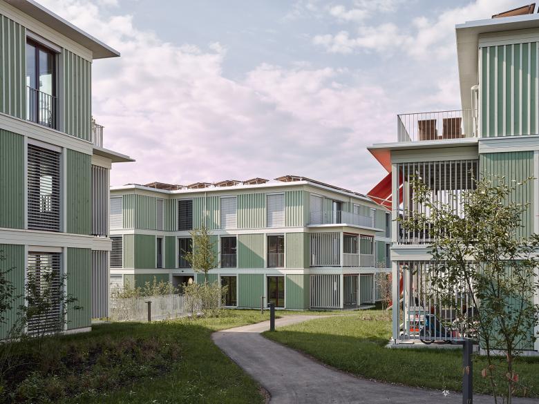 Die Gebäude weisen bezüglich ihrer Grösse alle die gleichen Grunddimensionen auf. Flügelpartien an den Ost- oder Westseiten sollen den Gebäuden eine Ausrichtung geben und optimale Besonnung und Belichtung der Wohnungen ermöglichen. Als einleitendes Gebäude erhält das Auftaktsgebäude zwei versetzte Flügelpartien die das räumliche „Strickmuster“ initiert. Alle Häuser sind vierspännig erschlossen und auf einem auf die Holzelementbauweise abgestimmten Gebäuderaster aufgebaut. Der Gebäudeaufbau ist gleich einer Zwiebel konzipiert. Der innere Kern wird in Beton erstellt, übernimmt aussteifende Wirkung und beherbergt das gesamte Erschliessungssystem. In einem zweiten Ring werden alle dienenden Räume wie Nasszellen, Entrées, Küchen und Réduits eingeschrieben, im dritten Ring werden alle Wohnräume untergebracht. Abschliessend übernimmt ein fragmentarischer, vierter Ring die Balkonelemente, welche als eigenständige Konstruktionen vor die Gebäudekörper hingestellt gelesen werden sollen.