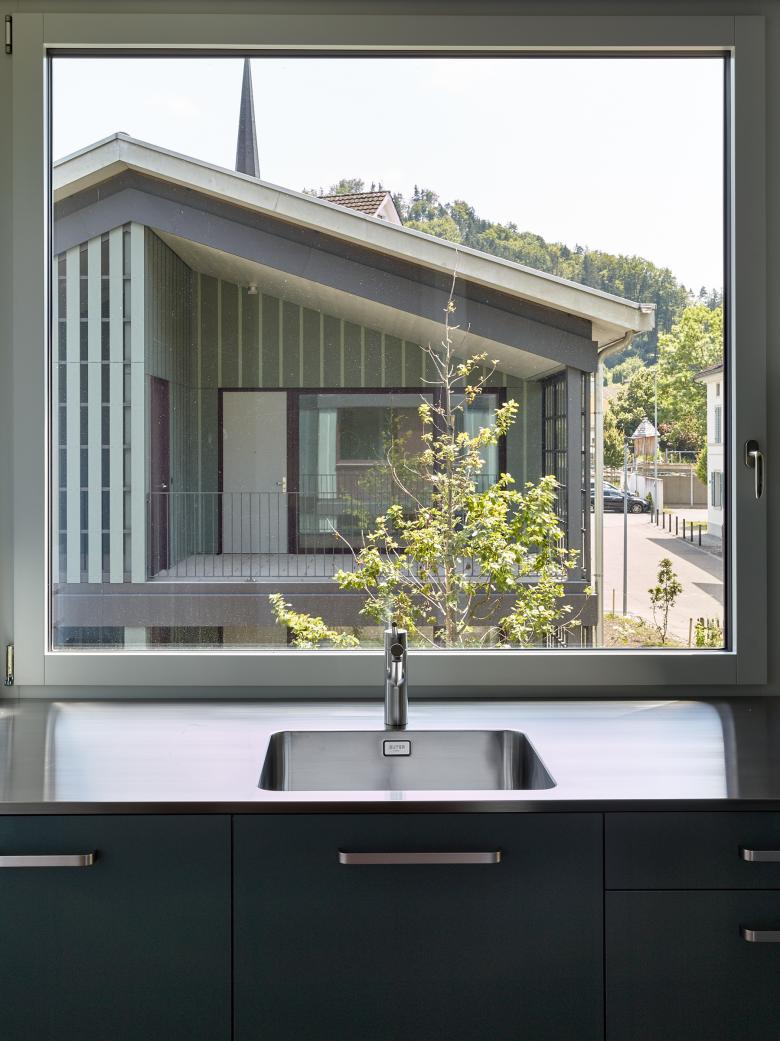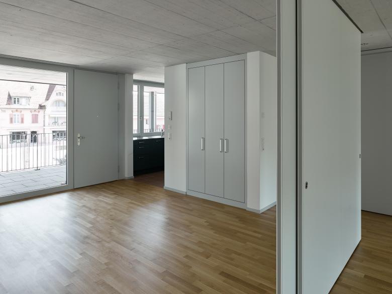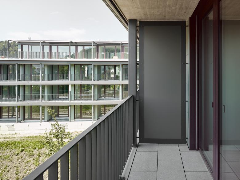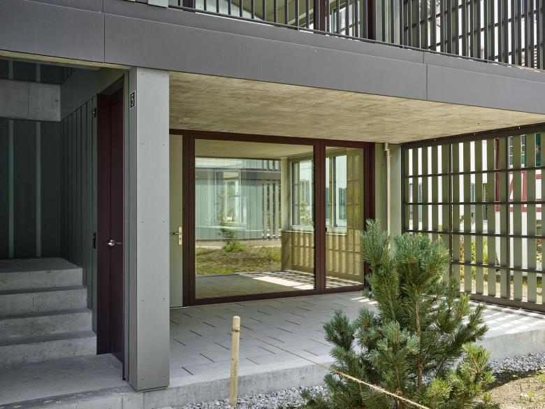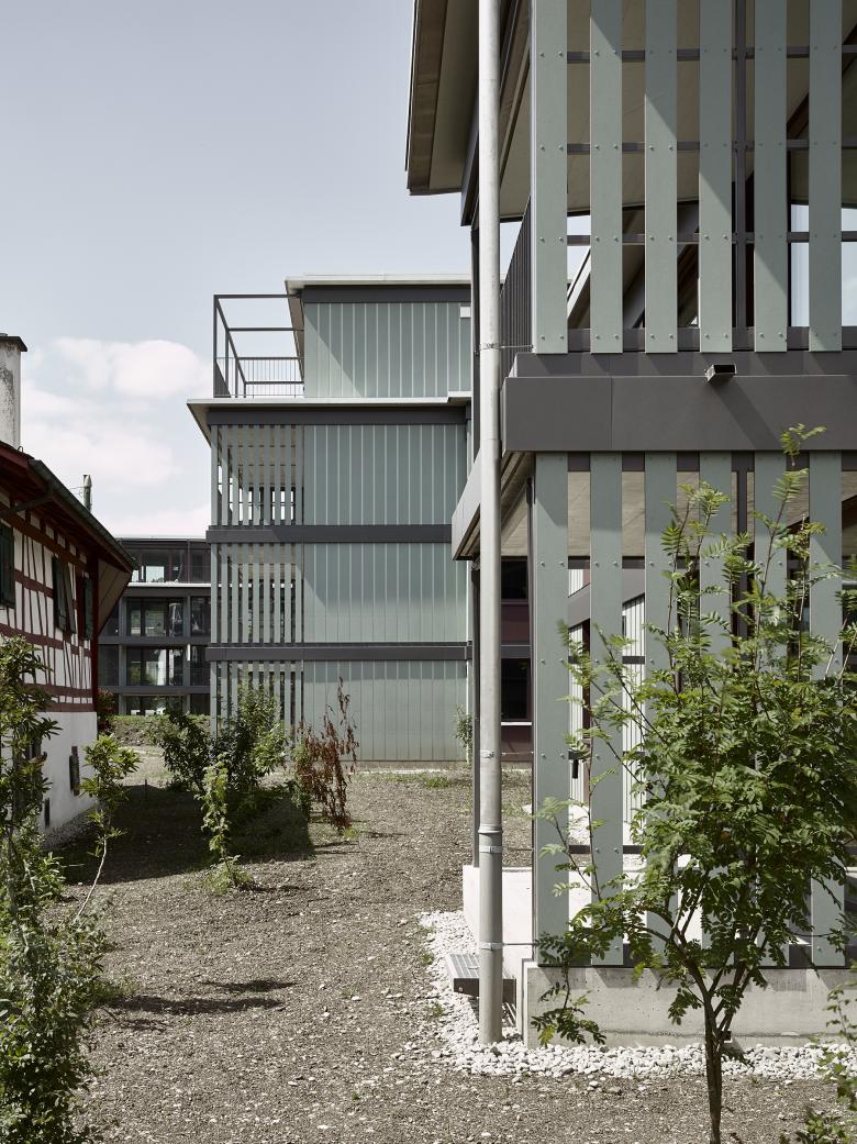 Die beiden zueinander ausgedreht stehenden Baukörper bestehen je aus einem Längsbau und einem dazu versetzten und losgelösten Punktbau. Die Wohnungen werden über Lauben und eine Kaskadentreppe erschlossen. Im Punktbau befinden sich die Familien-, im Längsbau kleineren Wohnungen. Die Baukörper werden durch eine regelmässige Abfolge von Schotten gegliedert, wobei sich über Schaltzimmer unterschiedliche Wohnungskonfigurationen ausbilden lassen. Ein System von Raumkammern und Nischen, von vor- und eingeschobenen Bauteilen sowie im Wohnbereich mittig angeordnete Schiebeelemente erzeugen eine vielseitige erleb- und nutzbare Wohnlandschaft. Gleichzeitig wird über die Anordnung der Individualräume und durch die Schiebeelemente eine Differenzierung der Privatsphäre innerhalb der Wohnung ermöglicht. Der Laubengang wird zum Begegnungs- und Aufenthaltsort, ermöglicht nachbarschaftliche Kontakte und stärkt das Gemeinschaftsgefühl.