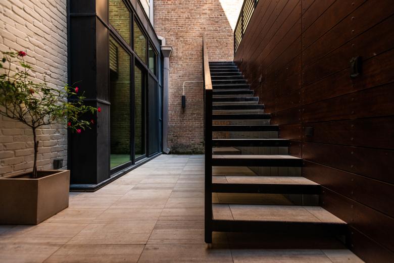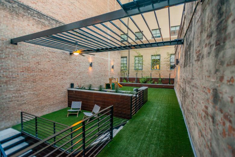 NANO designed a garage which is separated from the rear wall of the building, allowing light to get into the new first floor bedroom, and covered the roof with greenery that can be accessed immediately upon exiting the building on the second floor. Additional green walls climb the surrounding brick surfaces, creating a garden retreat in the heart of the urban environment. Through the development and analysis of sun studies, as well as private and public exterior space program needs, the design resolved to an “elevated backyard” with a courtyard and garage on the first floor. The courtyard is flanked by a cantilevered stair and garage on one side, with a protruding storefront on the other side. The “elevated backyard” has integrated plant beds, benches and split levels for seating and play areas. There is a sun trellis with lights and fans for comfort. This design resolved all of the client’s needs and provides the only single-family backyard within the CBD. The defining detail of this project is this is resolution of all the client’s needs within the program, and providing the only single privately owned property in the CBD that has a backyard.