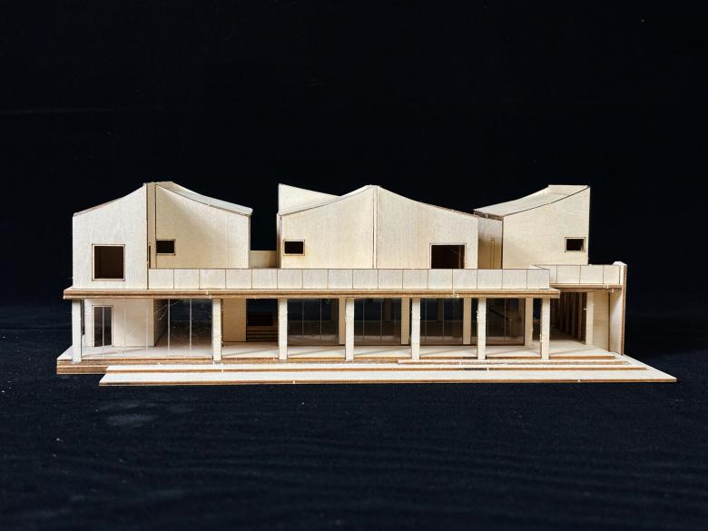 场地踏勘之时,建筑的钢结构柱网基坑已然成型,旧规划方案中的客厅设置在原有小学教室与宿舍的中间,整体连成线型空间格局,却也隔开了场地空间中庭院景观与外侧山体自然森林的呼应关系,故此咖啡客厅的设计作为连接场地的元素而诞生。