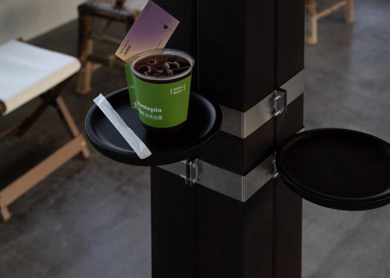 顺应杨梅园的自然地理形态,采用嵌入的方法在室外塑造出几块露天营业区,通过砌筑挡土墙、铺灰色砂砾石、使用原木加工的桌椅等方法来弱化这一片区对自然的入侵感,与周遭环境融为一体。
