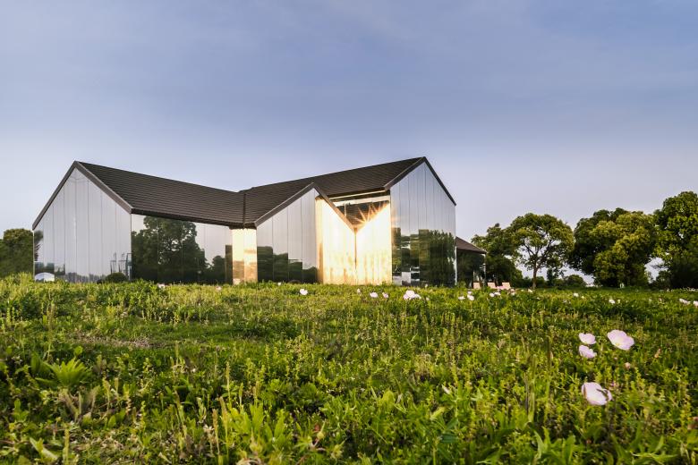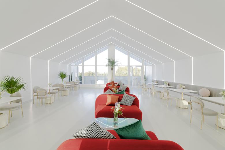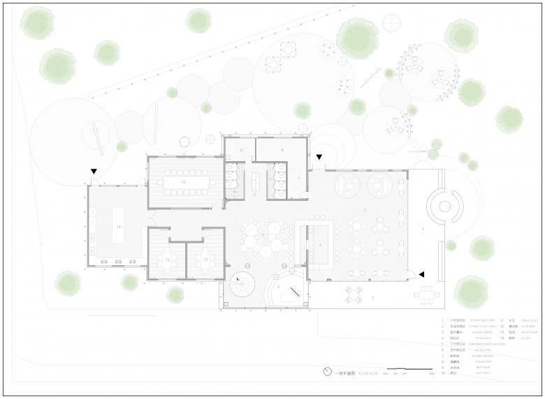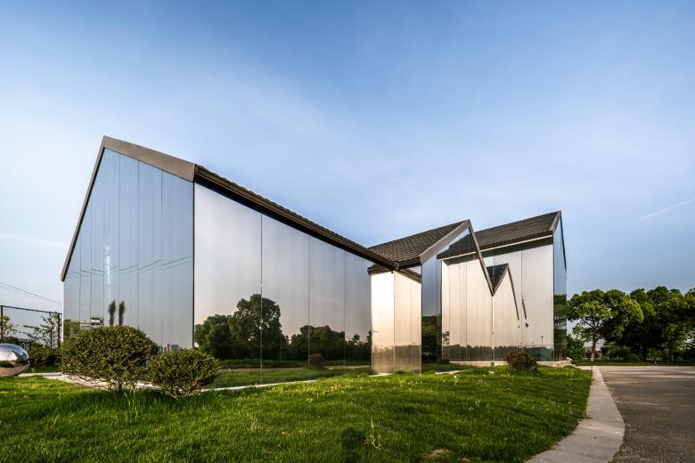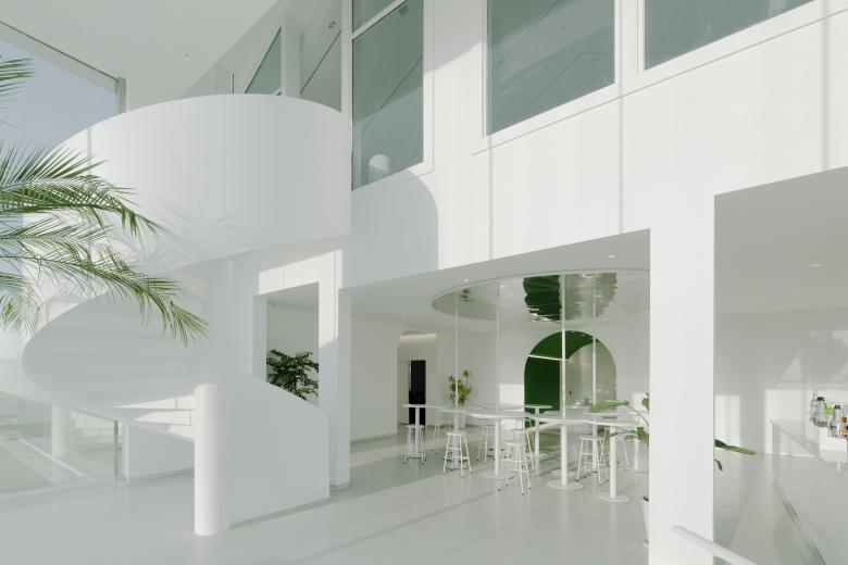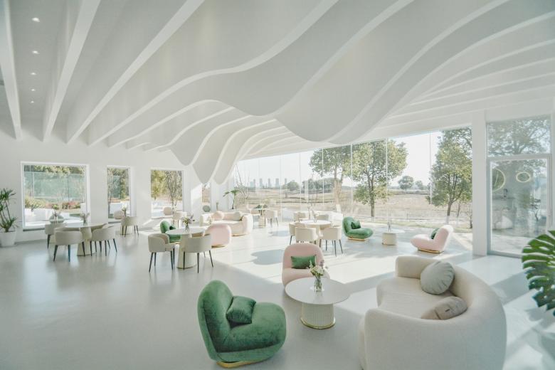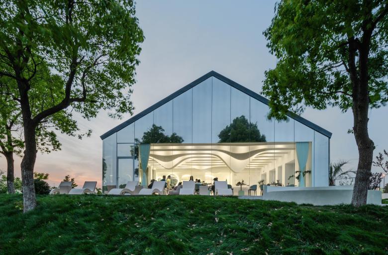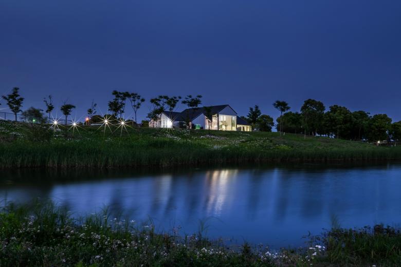 站在一座新城的角度去思考,公园里不可或缺的休闲配套其实是可以尝试更多可能性和想象力的,这种在公园里与大众紧密相关的配套建筑,大多仍处于完善基本功能需求的阶段,而其未来更多的可能性也是在这个层面上提升的,这样的改善表达的是所在城市的调性、关怀以及发展的态度与定位。作为设计师,我们想在太湖边做出一个有创造力并且能够成为公园区域性地标的建筑物,用简易的方式去设计和建造,让它能够提升城市公共空间的体验性,让人在公园中感到轻松与自然,让建筑尽可能融于环境。项目原是公园内的一处木质剪力墙结构的配套用房。 作为太湖新城的核心, 公园希望通过对原有建筑的改造,给予周边居民及外来游客服务的休闲聚集点。不论是在挥洒过汗水的运动后,还是在滨水漫步的午后,都可以在此休憩、用餐和聚会。形体的设计基于原有木制建筑的结构,错落穿插的体块生成了丰富的内部空间。白色的穿孔板与大面积的落地玻璃也被运用于设计中,形成了对内和对外两个不同的立面,一面朝向太湖,反射的效果令这个体量不大的建筑充分融入周围环境,让建筑映射人和城市的表情。一面朝向球场形成庭院,同时与公园以及场地建立紧密的关系。圆形地面的院子步道与金属球形雕塑作为最简单的主入口,简洁大方,符合LIM咖啡的品牌的主旨,在品赏美味之余,供访客合影留念。大面积的白色穿孔铝板,给人明亮轻松之感,引领来者进入馆中。阳光明媚,亦或是夕阳西下之际,单透镜面玻璃使建筑主体犹如湖边草地上的明珠,映衬着天空,云朵,花草,行人,别有一番韵致。建筑内休憩的人与外面流动的行人,相互映衬,互为画中。到了夜间,屋内灯火通明,它便是独一无二的独栋临湖酒吧。建筑一层包含了灵活有趣的开放空间,规模不同的包间,以及配套的厨卫后勤空间, 二层作为灵活布局,可举办不同的包场聚会活动。大厅内,结合原有木梁设计的白色波浪形状的吊顶,俏皮地倒挂在天花板上,映衬着窗外的天空和云朵,俨然生成了一幅画中画。灯光从挂片中打下,简洁高雅,营造出艺术的氛围。舒适的家具和地毯,提升了空间的品质,随意又不失精致感。自然摆放的二三盆绿植,有趣地点缀了这片纯白的空间。“建筑是凝固的音乐,音乐是流动的建筑。”走进下沉音乐区,白色雕塑感的钢琴优雅地矗立在旋转楼梯旁。琴键上缓缓流淌而出的音节,充斥着纯色的空间,引你驻足于此。此外,尺度适宜的包间也给来客提供了私密的区域,品质优异。二层简洁的线灯勾勒了完整保留的坡屋顶形态。大面的玻璃展现了窗外优美的风景,提升了空间品质。室外的院落区融进了天然的绿色场景中,仿佛在自然公园的卷轴上落下的神奇笔触,点点晕开,相连。圆形的外摆和吧台呼应着场地,呈现一幅自然艺术的图卷,引人驻足。晚间,明珠一般的灯饰点缀了暗夜,亮了院落。赏着夜色,人们在此聚集,畅谈。在这个飞速发展的时代,建筑设计总让我们急于进入高大上的豪宅里,逃离外面的喧嚣, 一关门就进入自己的小世界。公园作为一种媒介,能否把人从自己的空间里吸引出来,到城市里汇合,交流,互动呢?虽然基于原有结构的设计无法达到一个公园配套最佳的示范效果,但我们也不为此而感到遗憾,这也是对项目开发成本和时间考验的妥协。LIM咖啡希望凭借优雅大气的外观设计和有趣的内部空间布局为大众创造一个公园汇合点,增强人与人之间的互动,聆听彼此,创造更多的可能性。傍着碧波荡漾的太湖之水,依着郁郁葱葱的绿树青植,隐于生态体育公园的一隅。约上几个友人,在此休闲郊游,看花、漫步、望湖、锻炼,真不失为人间乐事。