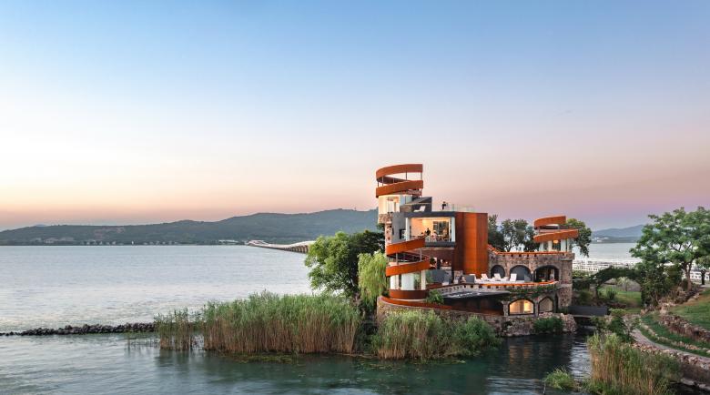 此次改造项目的核心理念是“历史与未来并置”。设计团队旨在通过现代设计手法,赋予这座历史建筑新的生命,选择耐候钢板和黑色钢板作为主要材料,耐候钢板的自然锈蚀效果与石头的古朴质感相得益彰,形成了鲜明的对比和和谐的统一,既保留了建筑的历史感,又赋予其现代感。该项目将成为太湖周边乃至长三角地区有知名度和美誉度的一张名片,打造一个集文旅度假、高端俱乐部、咖啡厅和艺术文化创作于一体的太湖度假区。