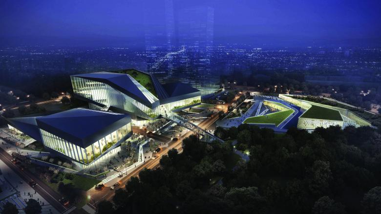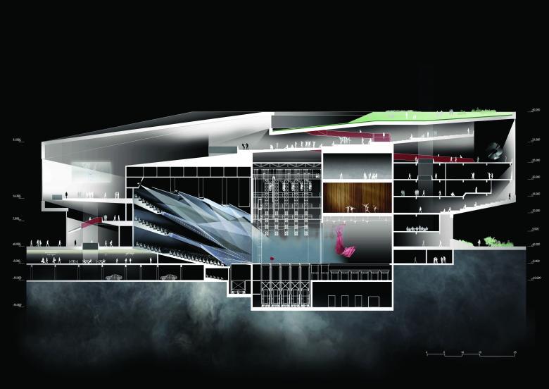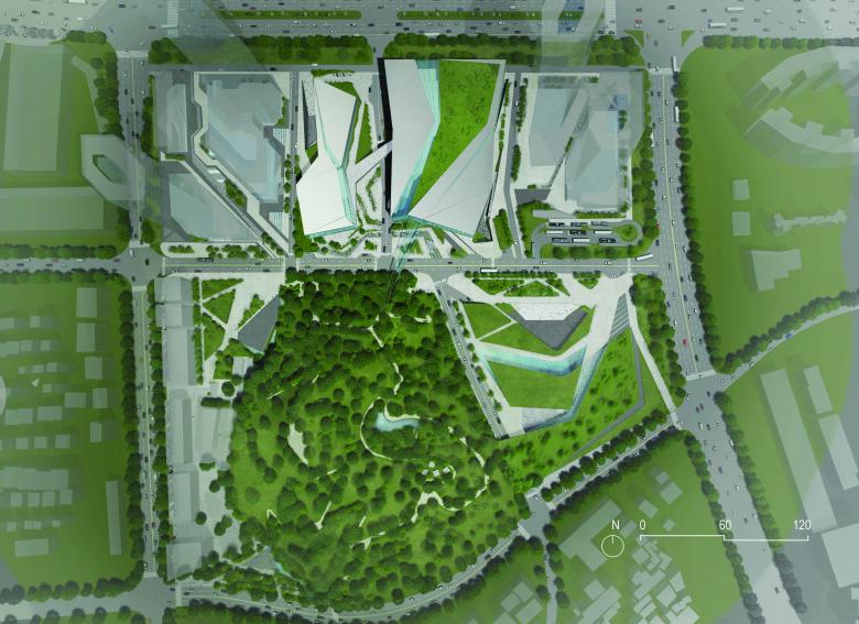 The concept started with the combination of human and nature. Taking the Golden Mountain Park, which is the most important local natural element into consideration. The new configuration has been shaped starting from a parametric analysis of the site, including water runoff, view, traffic and land use of the surrounding area. The aim of the design strategy is to foster the integration of this area into the surrounding with a vibrant, ecological, commercial program on the ground level and a highly social and cultural program on the top, so as to create a new model of the art centre.