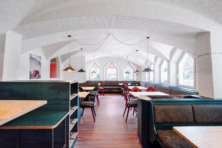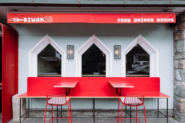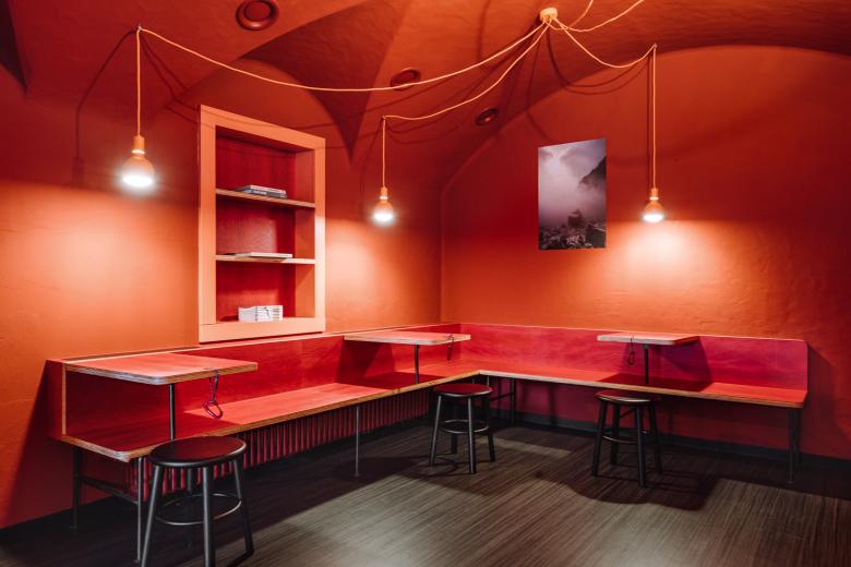 A consistent graphic concept sets selective accents. Following the principle of upcycling, the project focuses on reuse of materials, reorganizing of spaces and reassembling of chromatic scenario. The vaulted roof has been recovered and integrated into the new environment with the desire to give character to the space. Between the lively and dynamic bar area and the more intimate and reserved restaurant area, the room that expresses the theme of the project – the experience of the bivouac near the Croda dei Toni - has been created. It has been placed in an arched niche with the dominating red color, where the folding tables have been completed with climbing carabiners, recalling those of the bivouac. The high mountain bivouac has been revived in the Biwak 12. As a reminder of the link with the history and tradition of the area, the original Tyrolean “stube” has remained intact.