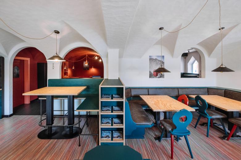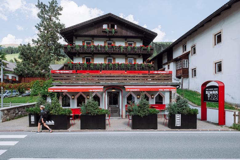 Biwak 12 is the conversion of a typical 1980s restaurant located in the mountain village of Moso, in the heart of the Sesto Dolomites, in South Tyrol. In a small village everything revolves around the theme of the mountains: the idea is to create a meeting place where young and experienced mountaineers, local population and tourists can stay together in a relaxed colorful atmosphere.