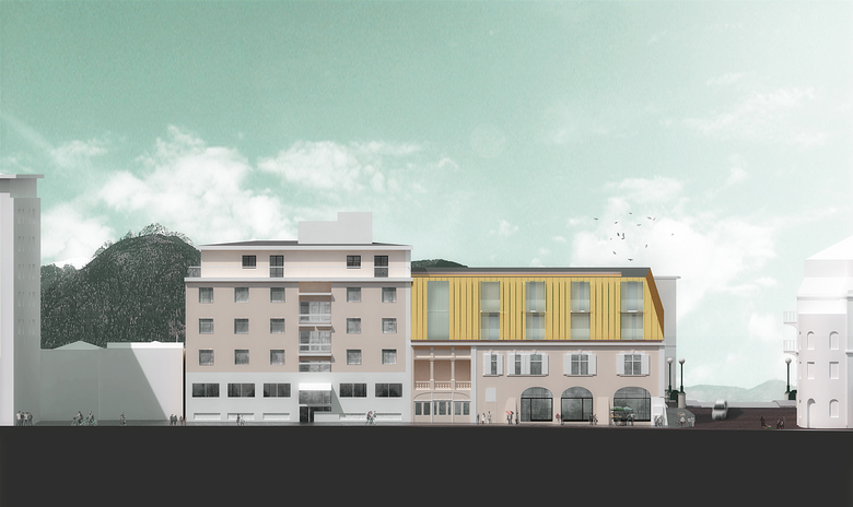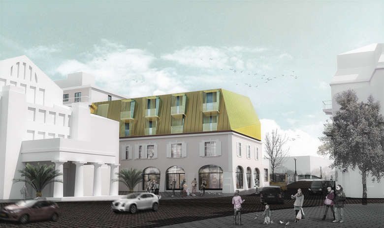 The extension of a hotel that draws attention to itself without disturbing the view of the prominent historical context and without dominating the existing whole.