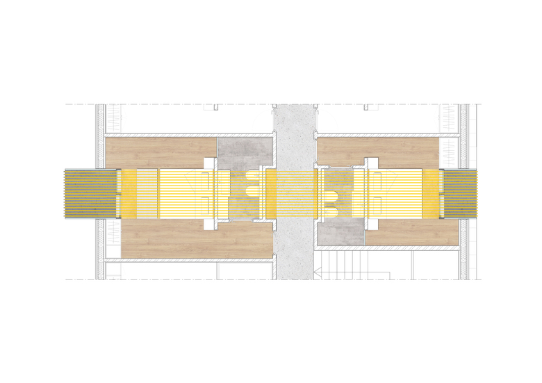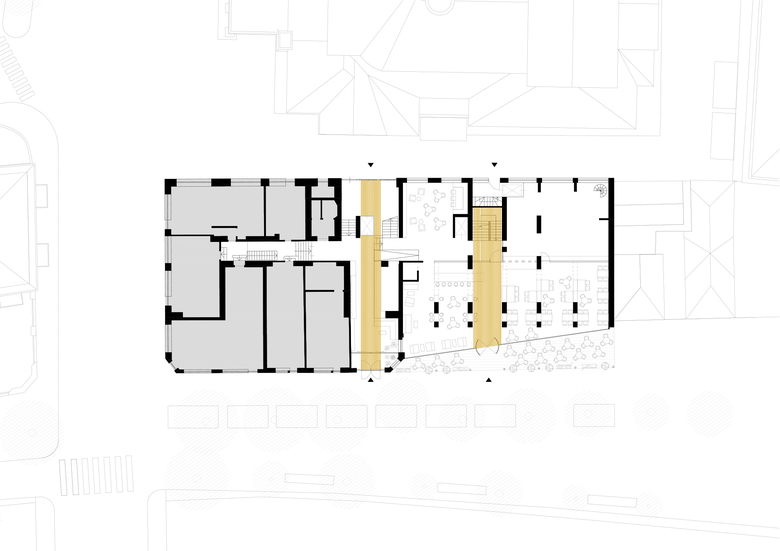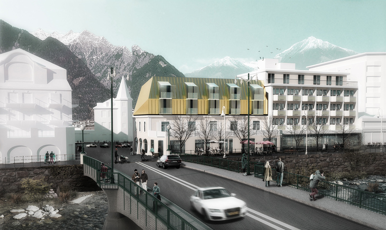At the same time, the project should be a visual continuation of the existing hotel with its fascinating rhythmic façade overlooking a promenade along the river and the thermal baths of the town. The volume of new room’s wing should not be read as a façade but as the surface of a pitched/inclined roof: the new intervention is separated from the existing through a small shadow gap, while a deliberately slightly-bent surface structures and breaks the volume and attracts at the same time the viewer’s gaze. The chosen material for the intervention is brass which repeats the material language of the surrounding liberty architecture as well as the interior of the existing Hotel. The new volume takes up the rhythm of the underlying existing façade and translates it into dormer-like glass structures that form balconies for the rooms.