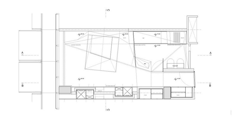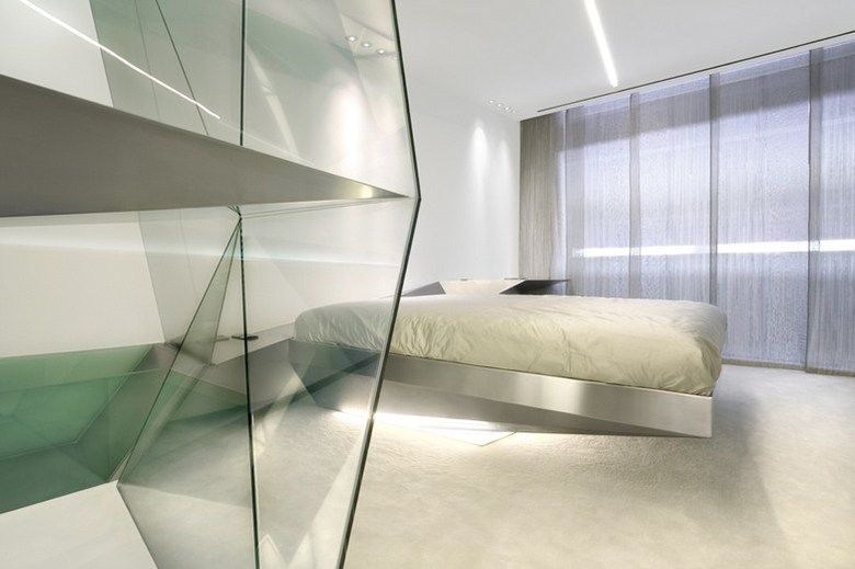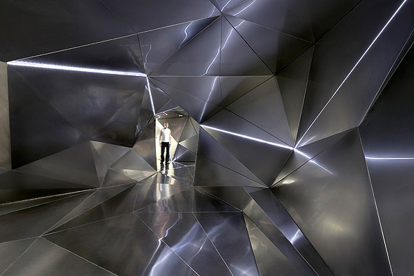 THE ROOMS-The rooms have been designed as a zone that links the artificial intensity of the trembling stainless steel tunnel with the exterior behind the plate glass window. Reverberations of the corridor in colour, material and geometry are employed not to destabilize, but to organize, to define the usual functions and to accommodate comfort and wellbeing. The room’s entrance area is shaped as a funnel towards the view through the window. Many visual relationships are projected onto the subtle geometry of the ceiling folds.