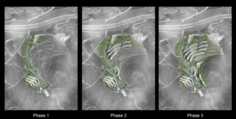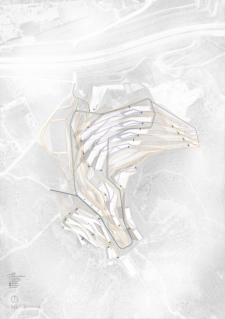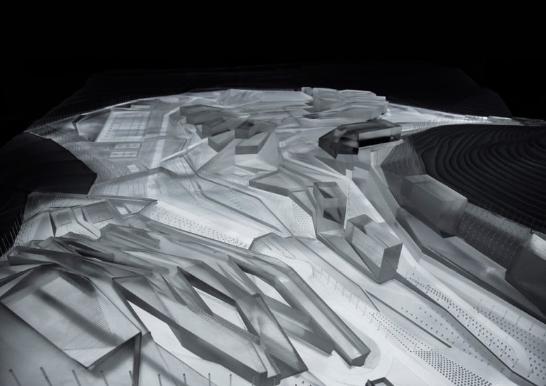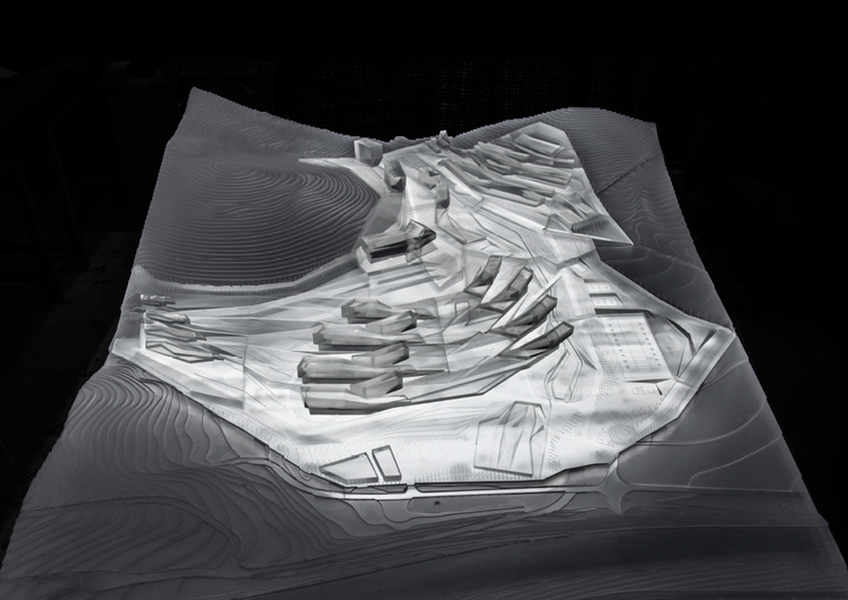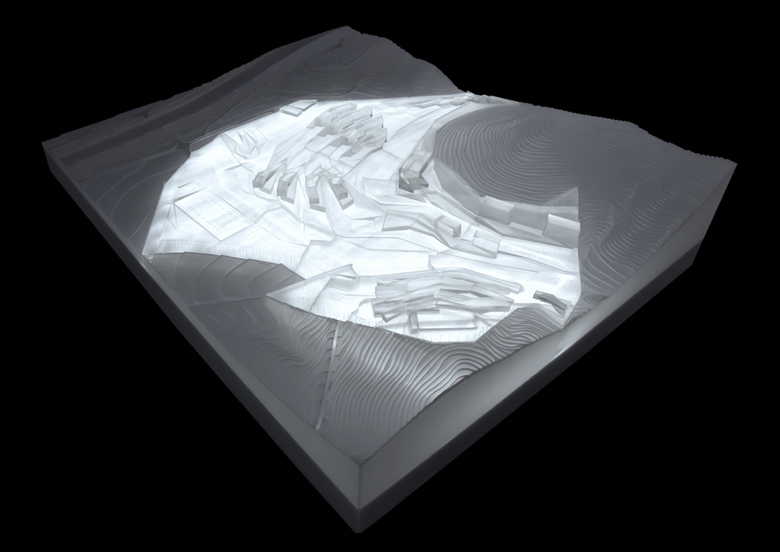 Given the steep topography of the terrain and the intention to stitch together the new buildings with the landscape, the task was to develop the massing as an artificial, jagged replication of the original hillscapes.