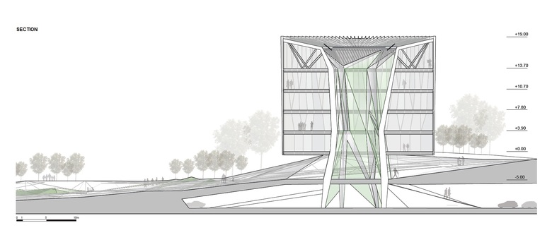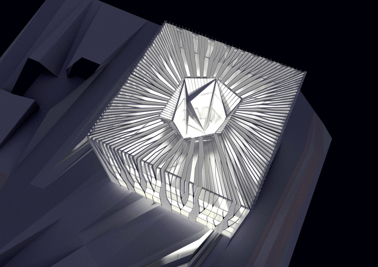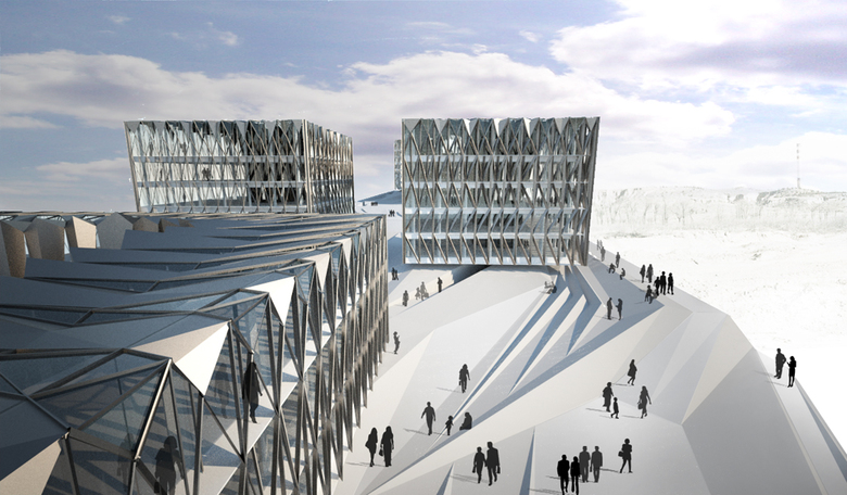 Each architect has been given a series of virtual volumes of which 75% of the vertices need to be retained. Plasma opted for a strategy that highlights and contrasts the Cartesian nature of the cubes with an expressive ground and internal core strategy. Given the fact that the ground is very loose and in many instances needs to be radically altered to suit the masterplan, Plasma Studio proposal is using these processes of artificially generated topography to produce a locally specific landscape – ripples, where the ground itself becomes a device for the organization of flows: flows of people, flows of cars (in the underground parking level) and finally flows of air (the air that is supplied to the various buildings will be channelled and preconditioned through a system of underground ducts). In this way, the ground itself operates as a multilayered and intense metabolic system whilst offering continuity to the Mongolian undulating landscape. Finally, there is no opposition between landscape and buildings. Neither is subordinating the other- they need each other to coexist. We propose the use of glass slots to bring light into the car parking and a develop series of cuts that enable pedestrian movement between the upper and lower layers. Mounts appear to support the buildings and hide a plethora of underground programmes. In this way, nothing spoils the sculptural composition of ground shape and buildings. The paths themselves are forming a tessellated mesh that enables multiple choices of routes. Walking along with them, the visitor experiences the building facades from opaque towards fully transparent. Just as the landscape is multitasking so do the voids: they function as light well, structure and service provider simultaneously. With floor plans between 24 and 32 Meters deep it needed to be introduced light wells breaking the traditional hierarchical rule where space on the edges is of better quality, becoming worse the more one gets towards the centre. Now the plan works as a ring without those black spots.