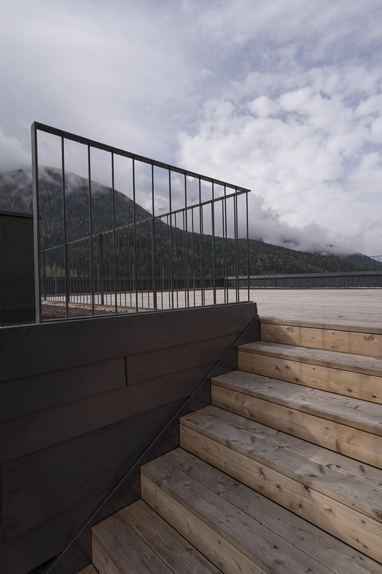 The new building’s envelope is made of only three main materials: it’s walls are clad with horizontal preoxidized copper sheets of various width while the Northern recessed area and the balconies are offset with larch wood strip boards. In addition, full-height glazing is predominantly employed on the Southern façade. The larch wood is treated with a pigmented graying solution of iron sulphate, in order to diversify the North service volume. Copper and larch wood are exposed to a natural change of colour caused by the atmospheric influence of sun, rain and snow; this phenomena, in addition to the repetition of the wooden colour code of the Villa, further increases the integration of the building into its context over time.