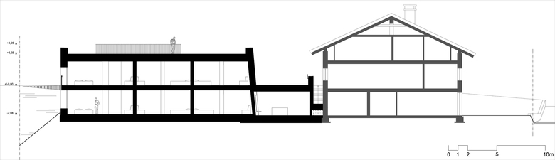 Although it is connected in the lower level to the existing villa, the new construction is designed to appear as a free-standing building. Perfectly integrated into the hillside thanks to its accessible extensive green roof with integrated terrace, the new volume occupies the full width the plot. It is slightly rotated in order to direct the South facade to the sun and the panoramic view. The joint in the lower level connects the new with the existing building and serves as common dining room. The East and North façades are relatively closed because of the interior’s functional distribution; furthermore, the North side is designed to show the clear separation between the new and the existing building. The volume is accessible from the street side, where also the car parking is located. The six spacious holiday apartments are directed to the sun, with panoramic view of the Dolomites.