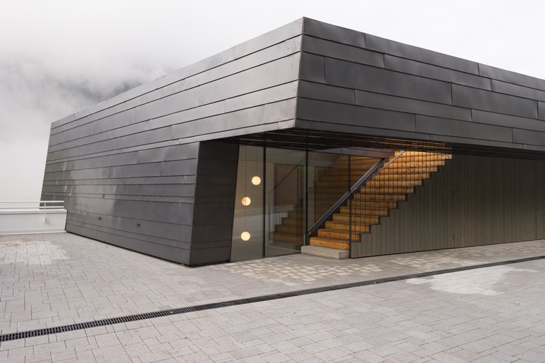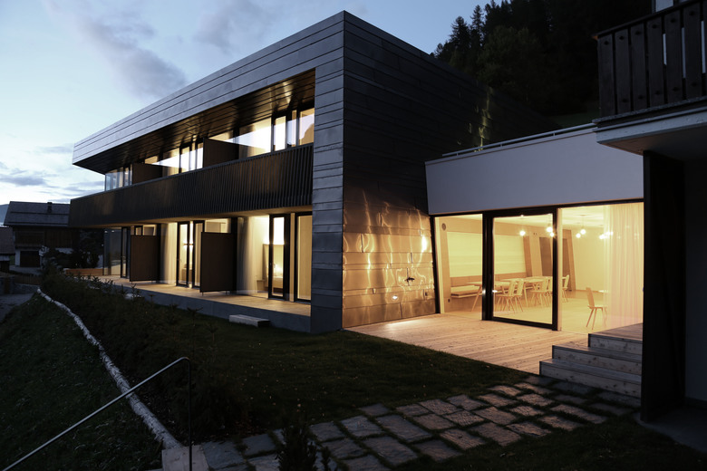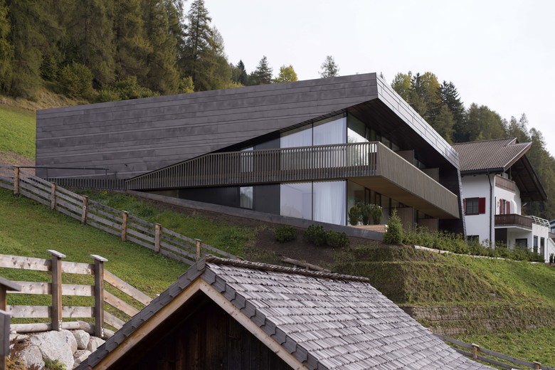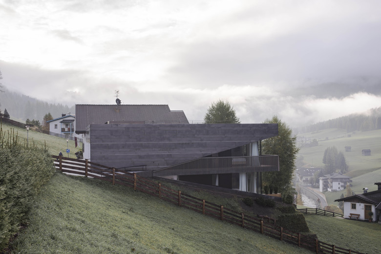 Residence Villa Drei Birken is located on a hillside at the end of a residential area in the Dolomites. The Villa, built in 1960 and renovated in the 80’s, originally consisted of a simple and low volume with owner’s apartment and four holiday flats. The new extension adds six holiday apartments as well as functional and common spaces. The facade opens through a V-shaped surface from the mostly closed North facade to the completely glazed South facade, facing the sun and the panoramic view of the Dolomites.