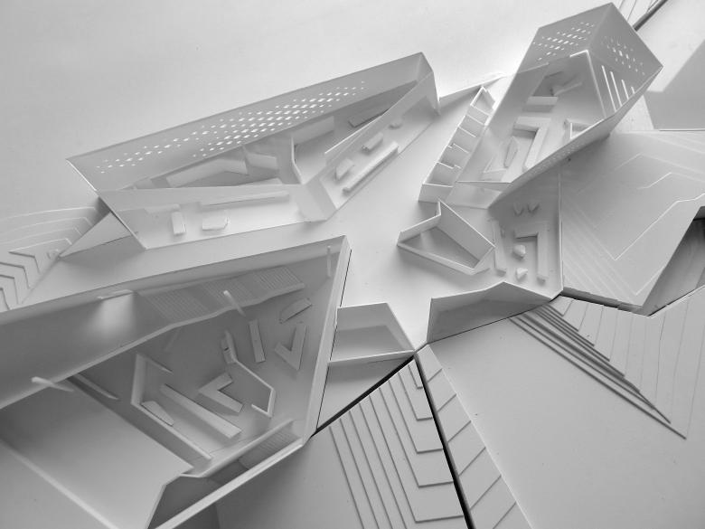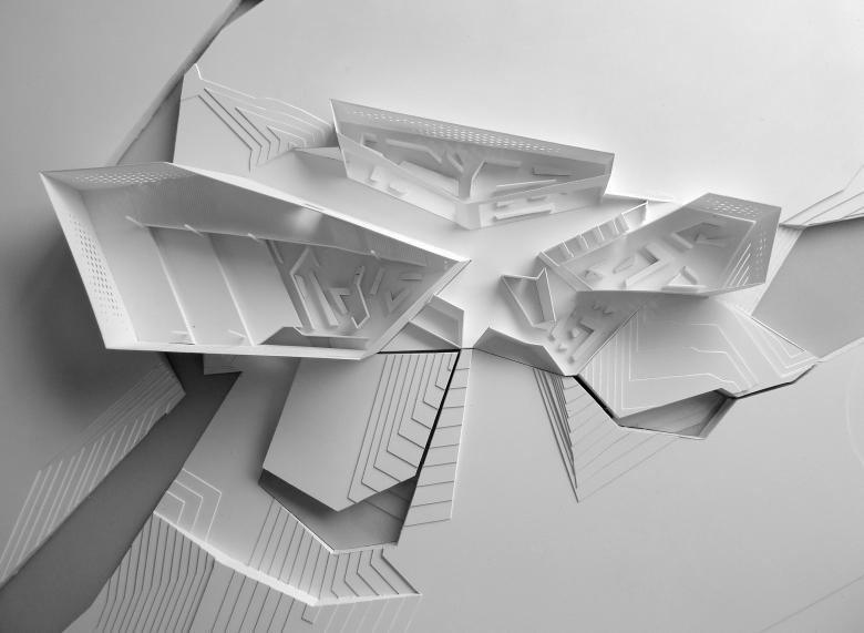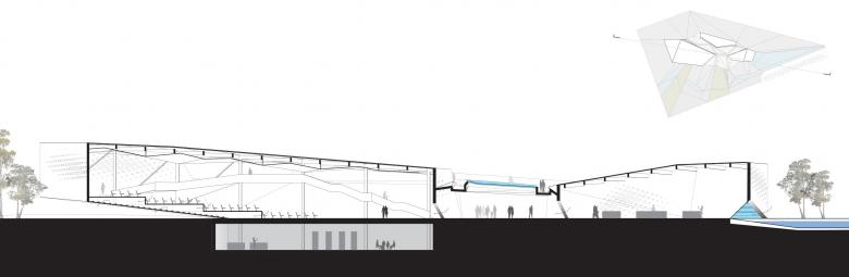 The competition asked for three main programs: multifunctional hall, interactive hall, temporary exhibition space. These are duly and legibly represented as three main crystalline volumes of the project. These solids are connected by a tessellated mesh, and thus internally merged into one continuous yet differentiated space. The main entrance leads into a central daylight atrium from which all the other spaces can be seen and accessed.