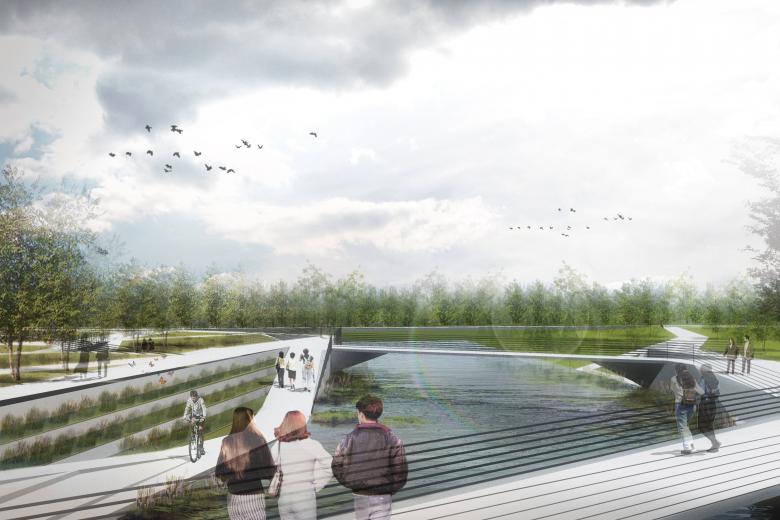 Another important aspect of this building is its integration with the ground plane. Sunken two meters into the earth, visitors descend to the entrance. The volume of excavated earth is diverted to mounds surrounding the building as an articulated landscape that, together with the built volumes, is shaped to maximize rainwater collection into specifically designed water pools. These water pools drain into two large water bodies at either end of the building. In this way, the building appears as a bridge spanning across a river. Additionally, the water bodies pre-cool the air intake on the east side, significantly adding to the natural ventilation process all year round.