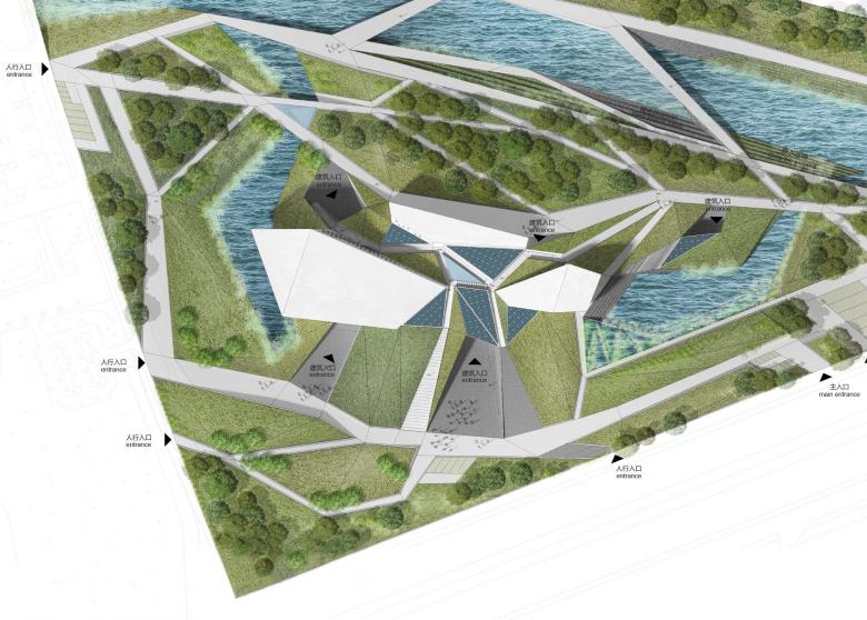 The inspiration for the Low-Carbon Exhibition Centre stems from geology: carbon is a product of intense geological forces and processes, its polygonal structure at once incredibly strong while adhering to linear and planar principles.