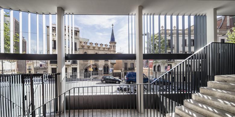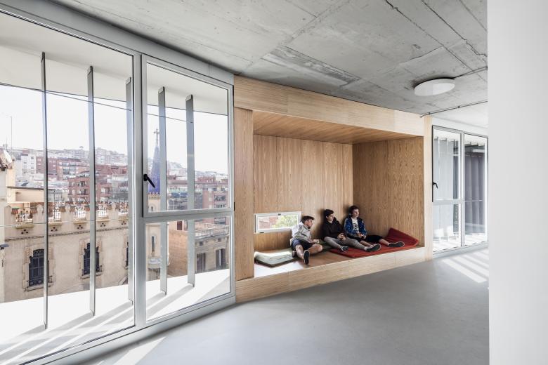 Un principe opératif de couloir-armoire organise l’espace de circulation. À chaque étage, et faisant face à la rue, ont été disposées des boites en bois pensées comme le lieu de l’échange informel entre élèves. Cette idée motrice du projet, circulations actives et aires d’échange, constitue la colonne vertébrale d’une proposition dynamique, enrichissant l’ensemble du centre scolaire et favorisant les espaces d’échanges qui y sont disséminés. Parallèlement, la volonté de doter chaque étage de points spécifiques d’interrelation et d’échange d’information entre les élèves et les professeurs, génère une distribution organisée autour d’un noyau central compact, composé de salles de séminaires et de bureaux.
