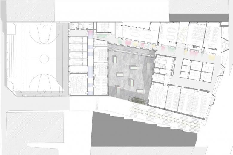 L’accès à l’école a été pensé comme un espace dilaté du trottoir. Cet espace, qui fonctionne comme un espace privé partagé, puisqu’extension de l’espace public (ep), se développe sur une double hauteur accentuant le rituel d’accès à l’école et le dotant d’une échelle urbaine.