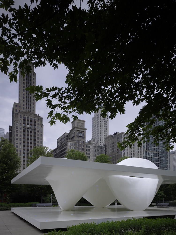 Placed on the unique location in the middle of Millennium Park framed by the Lake Michigan on one site and Michigan Avenue on the other, the UNStudio pavilion relates itself to diverse city-contexts, -programs and -scales. Programmatically the pavilion invites people to, gather together, walk around and through, to explore and watch. The UNStudio pavilion is sculptural, very accessible and it acts as an urban activator.
