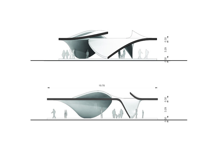 Based on the specificity of the site, the design of the pavilion develops an elaborated relationship to the existing form of a rigid geometry but it also introduces a floating and multi-directional space. It orients itself to the city texture, to the flows of visitors exploring Millennium Park and most importantly introduces diverse vistas towards the park and city surroundings. The pavilion is open towards its sides in between two at the outset horizontal planes of a podium and a roof.