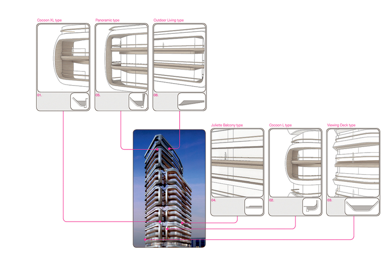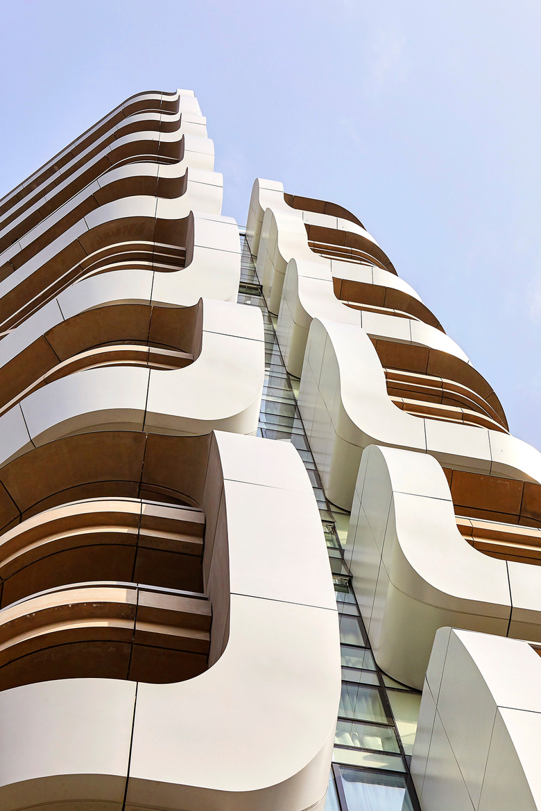 The modelling of the balconies within each grouped cluster lends variability to the facade and the living experience for the residents in the building. As outdoor spaces play a large role in the enjoyment of living environments, the creation of unique, sheltered spaces of high quality was a driver in early design development. The aspect of using both textured and smooth materials contrasts with the expected contemporariness of a typical high-rise metal construction and lends this facade a residential 'twist.'