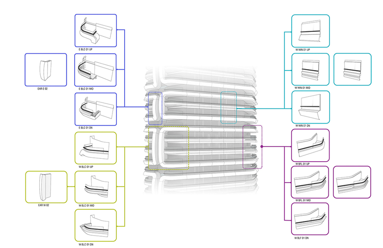 Contrasting materials are employed within each grouping, where the 'outer' smooth metallic element is complemented by an 'inner' use of textured materials. Throughout the building the cluster concept of the facade is designed to maximise levels of transparency and frame the views towards the sky, thereby lending the tower a softer and more nuanced silhouette.