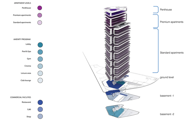 The 22,000m2 Canaletto residential tower in London employs the concept of clustering several floors together to establish a group of ‘vertical communities’.