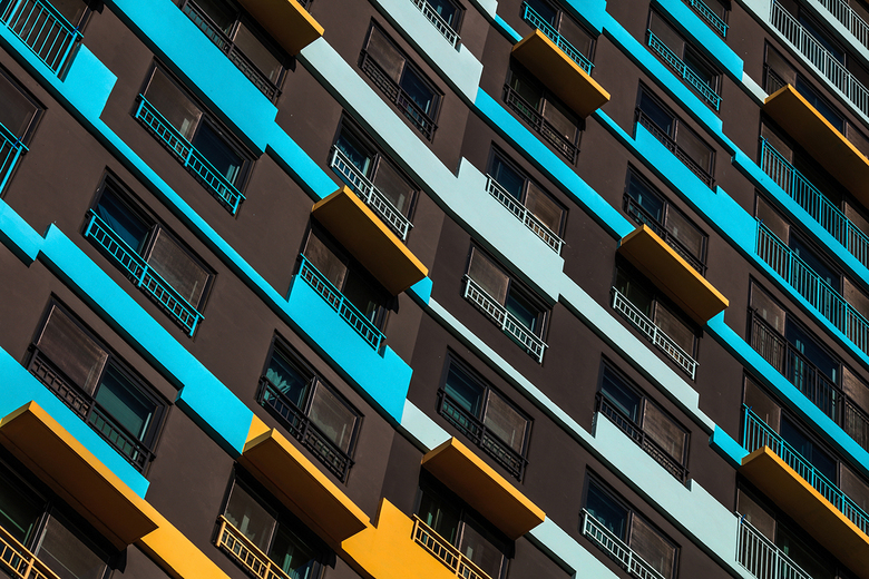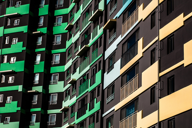 On the neighbourhood scale, the façades transform from a typical grid of windows into a textured and articulated field of colour. In Block 1 the façade construction receives a matrix of options for additional layers that respond differently to each opening and balcony. All together, they form a system of horizontal bands that extrude over the face of the wall, offering the desired depth and shadow effect. Every apartment becomes unique, reinforcing a sense of identity and ownership for its residents. In Block 2 a diagonal pixilation of colour blocking is applied to achieve the same results.