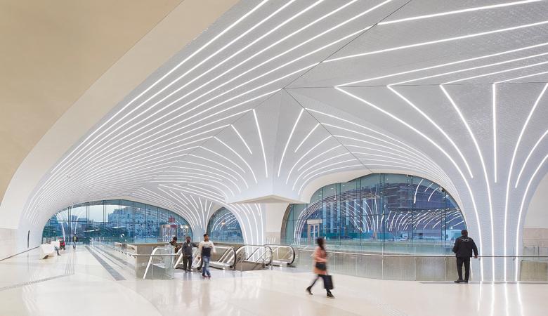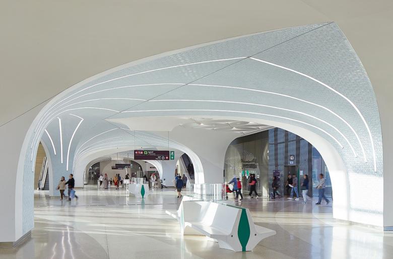 The use of this uniquely Qatari ornamentation and material palette assists in dividing the large interior spaces and guiding pedestrians towards the transient spaces. The integrated light lines amplify the experience, function as natural wayfinding elements and contribute to a unique ambience for the Metro Network.