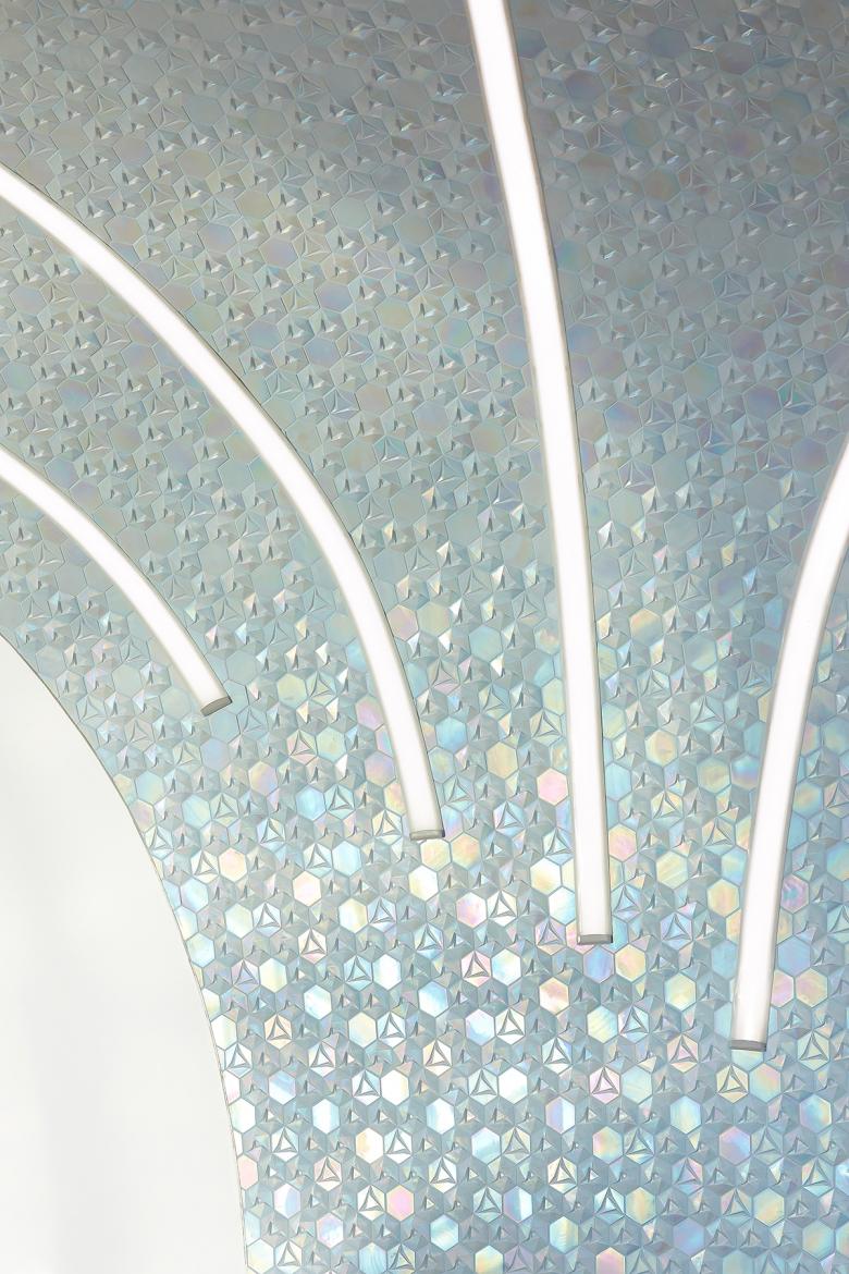 The materialisation principles are experienced through a duality of a pure, modest exterior versus a rich, illuminated mother of pearl effect interior. The exteriors reference the monolithic strength of old Qatari architecture, while the interior spaces create a radiant effect of movement and fluidity.