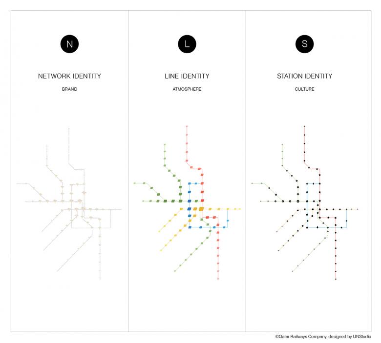 UNStudio created a vision for the station designs of the all-new Doha Metro Network, and collaborated with the Qatar Rail Architecture Department on the development of an 'Architectural Branding Manual': an extensive set of design guidelines, architectural details and material outlines to assure the spatial quality and identity of the network. This comprehensive design manual served as a set of guidelines that were used by the appointed D&B contractors to deliver the different station types for the first phase.