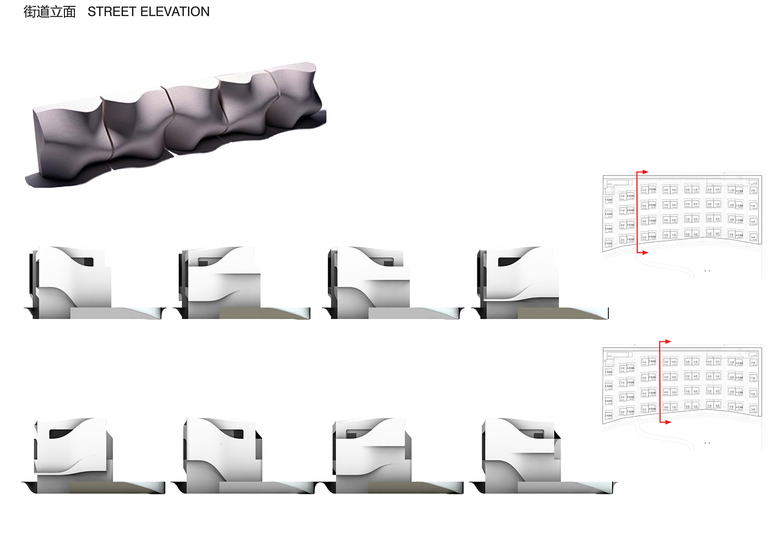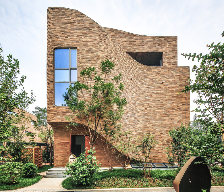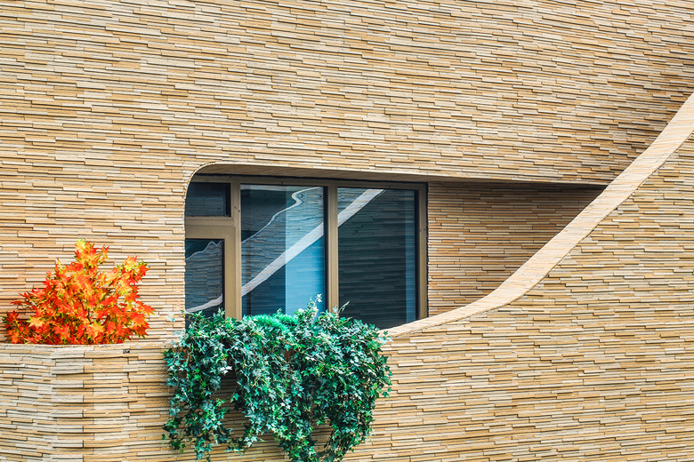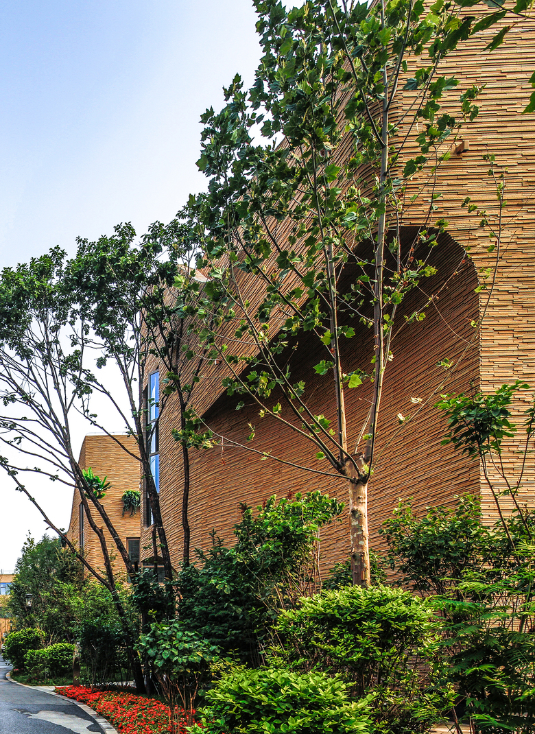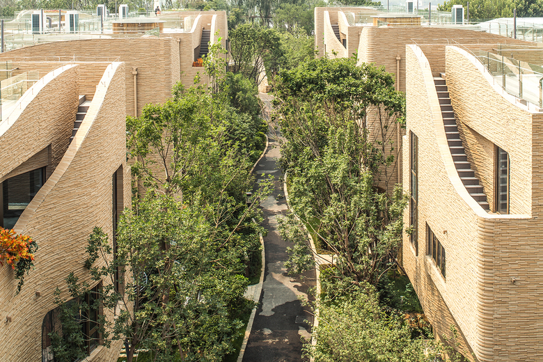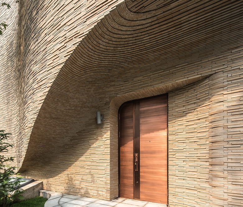 The addition of these facade features further connects the experience of the architecture to the surrounding landscapes. Through slight transformations in shape - created by the slight twisting of the curved surfaces of the façade - rhythm in the elevations is created which adds continuity and further unifies the architecture with the landscape. In addition the clay color of the facade fosters this intrinsic connection between built and natural environment. The facade cladding is made from recycled stone produced from powdered stone and is applied to the facade in a contemporary fashion. This enables the realisation of the fluent curves, while permitting the necessary tolerances for the local construction team.