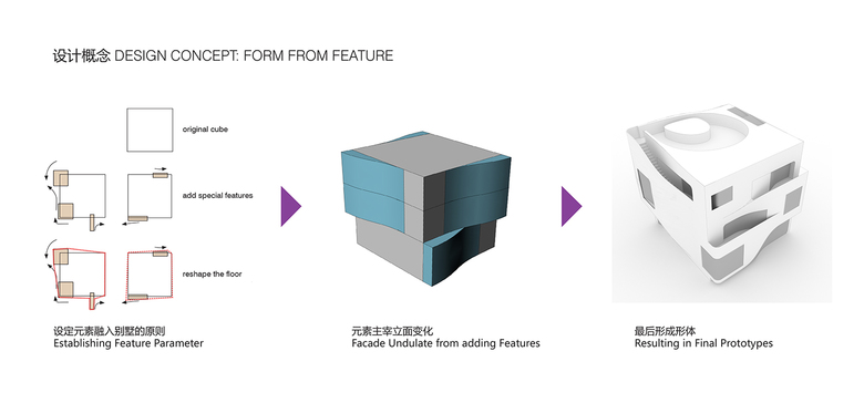 Facade design – The architectural masterplan envisions sculptural villas scattered along the riverside, each with its own characteristics and living spaces and embedded in the communal space to stimulate a neighborhood effect. The facades of the villas are designed to create a strong inside/outside condition and in order to achieve this employ different ‘sets’ of integrated features, including balconies, bay windows, canopies or terraces and roof-top gardens. Various arrangements of these features are applied to create different types of villas across the compound, enabling variety and preserving the sense of uniqueness through the organisation of geometric elements. Through the creation of these base elements, numerous variations are made possible, while keeping an overall balance and consistency throughout the development and enhancing the efficiency in the actual production and construction of the facade.