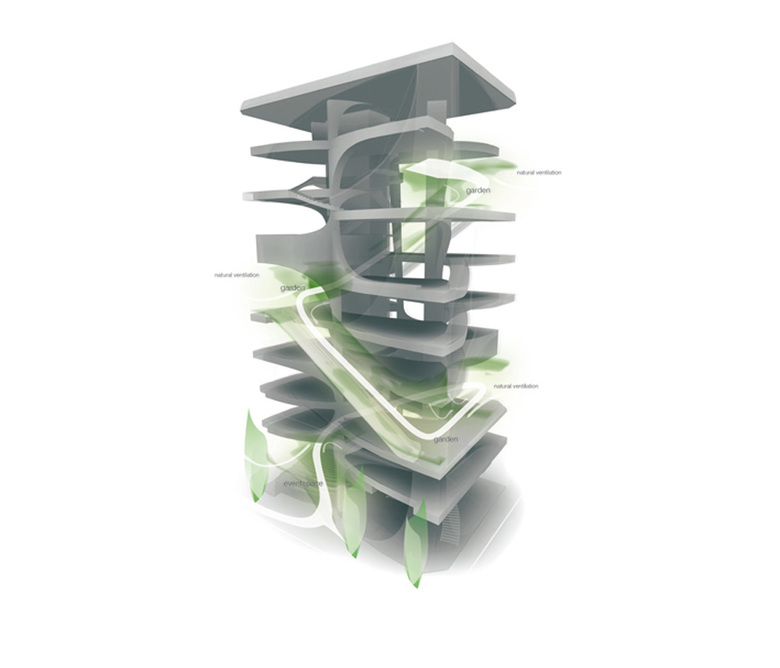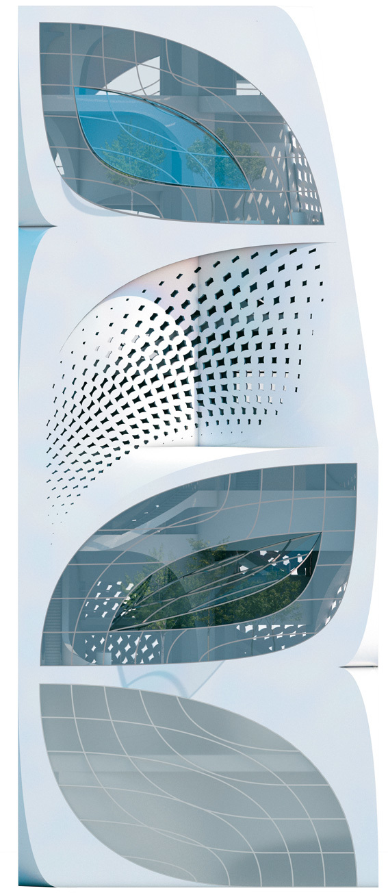 In this design, the element that holds the vision together and moves through all the scale levels is the leaf shape. Both the façades and the floor plans are characterized by large, leaf-shaped perforations and indentations that sweep over several floor levels. The leaf is thus found in the floor plan, in the section and in the elevation. It has been applied to the construction as well, responding to location-specific constructional demands.