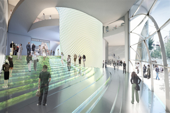 Imagining Louis Vuitton – The proposal aims to establish an architectural equivalent of the identity of Louis Vuitton, which consists of a blend of classical and modern qualities. The LV products celebrate traditional craftsmanship, the mythology of travel, and luxury and celebrity. As a collection, these products create a historic line that connects you, as the customer, to other contemporary and historic participants in the material culture of Louis Vuitton. This material continuity is materialized in the architecture.