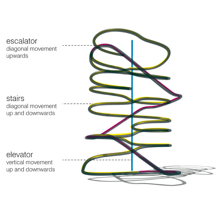 The idea of the Maison – The building follows the structure of a (grand) house: we distinguish three levels, each spanning a varying number of split-level floors. The three zones are vertically connected by a spine housing stairs and elevators; visitors can take the elevator to the top of their chosen section and then meander down, using the peripheral, curved staircases that connect the split-level floors.